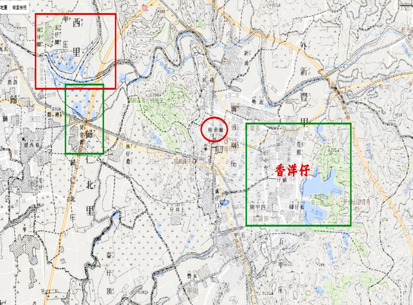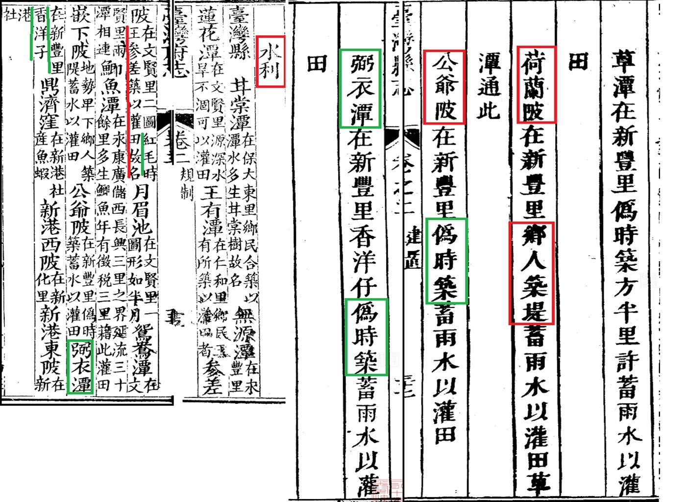 香洋仔之東,有灌溉煙草、水果與稻田的蓄水潭陂,分別叫「草潭」、「荷蘭陂」與「公爺陂」(圖二),還有「弼衣潭」。到如今,水土有變,東邊有大潭埤,影跡依然可串連(圖三)。值得進一步結構聯想的,是荷鄭時代修築之堤防,由「鄉人」,故工法應該不是荷蘭人的堤壩(dijk, dam)。所以,其他地方若有「紅毛埤」之名,也應謹慎考證,臺灣人不要輕易畫唬爛(Holland)比較好,比較有自尊,不會把自己勞動成果,歸功給外來殖民者。