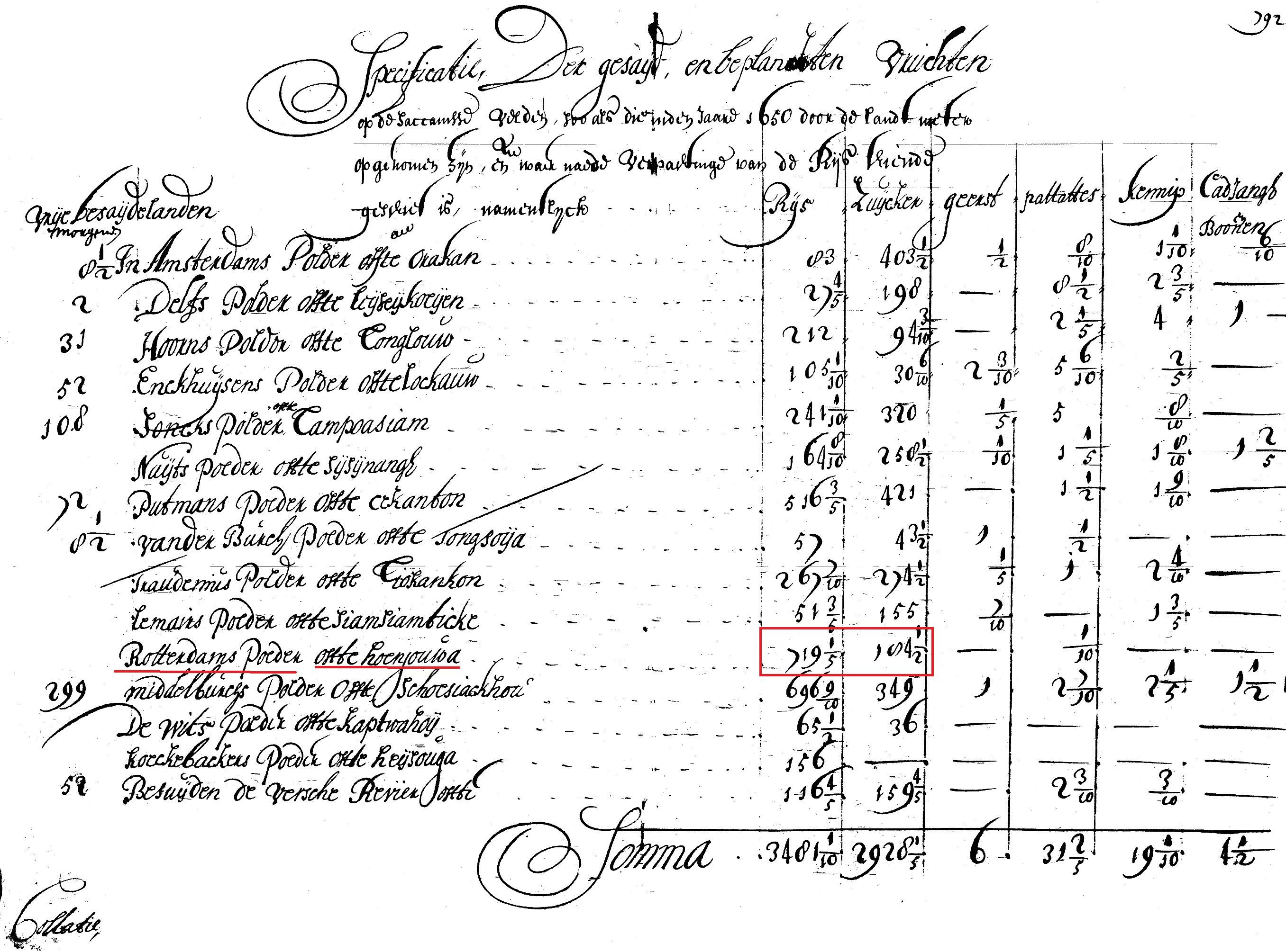 臺南關廟在山西,進入歷史甚早,以前地名叫「香洋仔」,旁邊還有「花園」古老地名,老地名其實會在闇黑歷史中放射著不尋常光影。香洋仔、花園,老番一、二十年前就解釋是種植煙草、菜蔬水果的平洋田園而得名。香洋仔,或者正確一點應該寫成「菸洋仔Hun-iônn-á」。這地方在荷蘭時代已進行開發,從土地登記單來看(圖一),這裡在1650年,已有七百多甲水田,與一百八十幾甲蔗園。那時被荷蘭文記名為「鹿特丹農場(Rotterdams polder)」,漢語則命名為:Hoenjouwa(=Hun-iônn-á)。附上的土地登記單,雖未登記種植菸草,但從資料來看,1643年,臺灣已輸出赤崁菸草到東南亞。當時人寫成「香洋仔」,但菸草久不種後,人們就不知如何念「香」了,後來人忘記原意而唸成Hiunn-iônn-á,並文創出關廟農民出口成章,看水田一片稻香洋溢,詩興大發命名香洋。