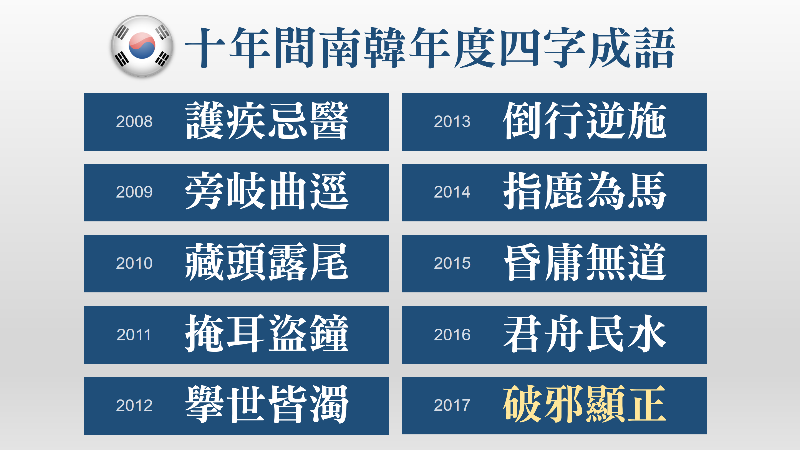 南韓的公私立大學各領域教授發起申辦的週刊《教授新聞》,透過1000位教授的問卷調查,決定出代表2017的年度成語為「破邪顯正」,這4個字明顯是針貶時政而來,而這詞獲得其中340名(34%)教授的青睞。