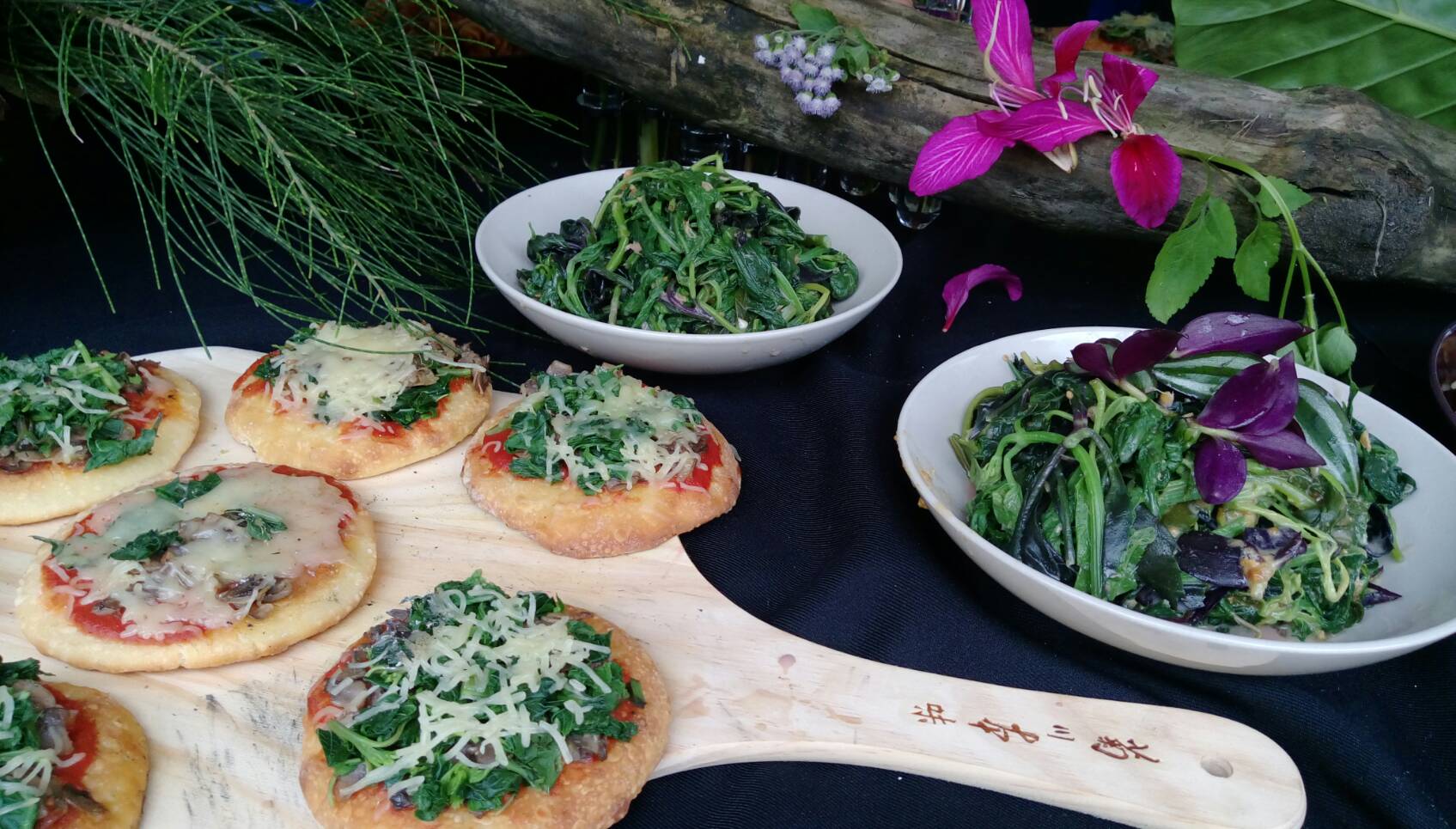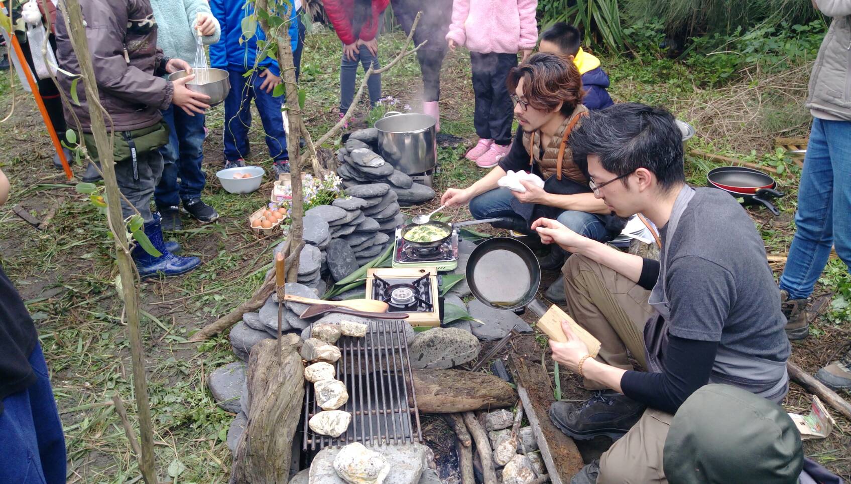 「開始搭灶生火,也不忘「林下多層次農法」的概念,用桑椹的枝幹、漂流木及野花藤蔓,甚至岩板來點綴一番,達到高效能又美觀的「野式爐台」。而這爐台的設計是為此次菜單量身打造的,從野菜蘑菇Pizza、野菜巫婆湯、薄荷烘蛋到薑麻油花生拌野菜,都非常合適在這裡烹煮產生。