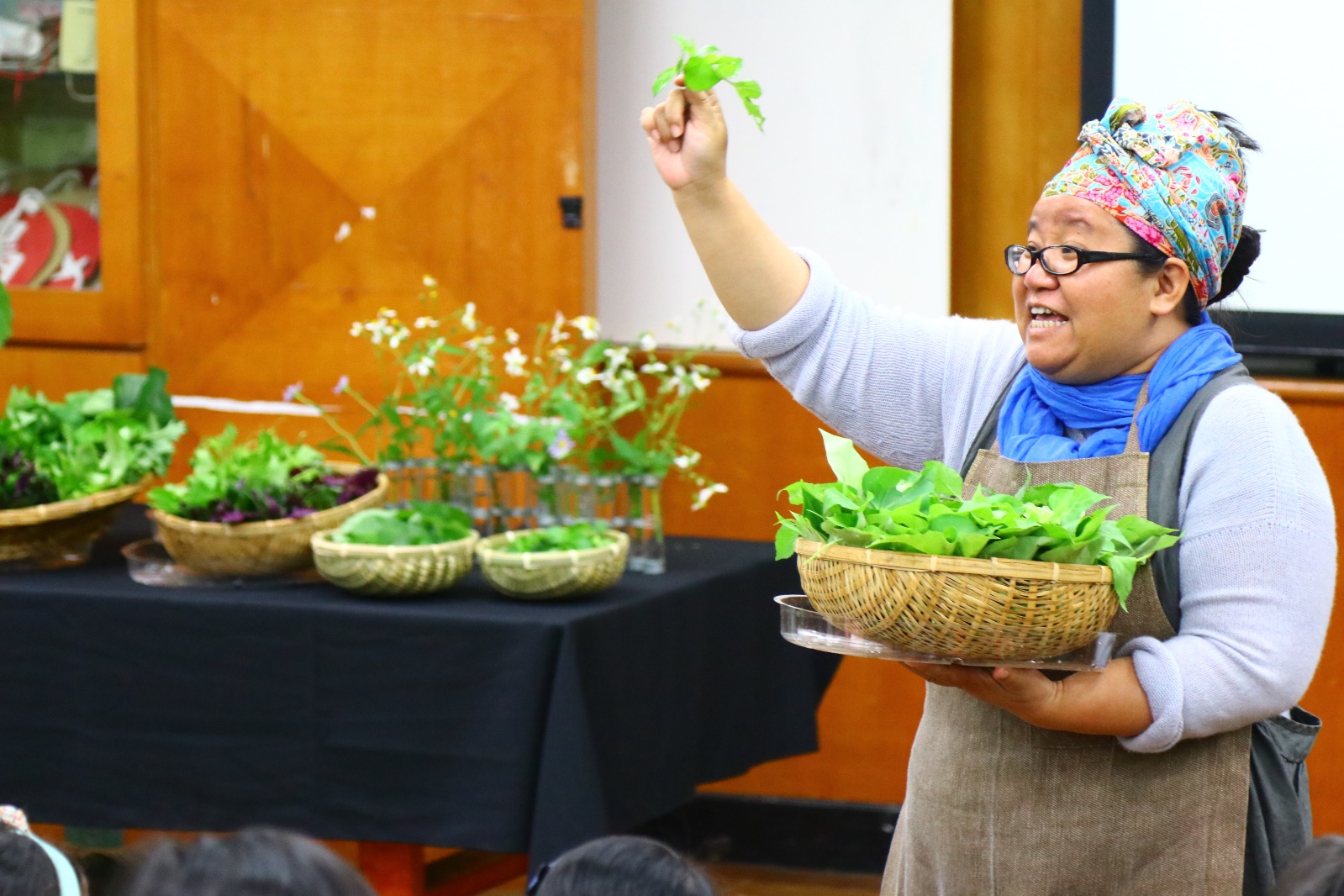 秀娟老師想出了「阿比野菜」的名稱,阿比就是「阿拉比卡咖啡」,阿比野菜,指的就是「阿拉比卡咖啡樹下自然栽種的野菜」,這樣的野菜,自然營養又健康,如果我們可以讓我們的孩子,從小就認識這樣的栽種方式,吃到這樣健康又自然的野菜,種下了孩子心中的善良種子,也讓孩子去影響大人的消費習慣,是不是可以支持更多的農夫更願意投入這樣的自然栽種方式呢?是不是可以讓台灣各地更多人,願意讓土地有更好的永續利用呢?所以,秀娟老師擬定了「阿比野菜環島」計畫,從今年的3月到6月,預計帶著台東的阿比野菜,到台灣本島的17個縣市,18所國小(註2),給小朋友介紹阿比野菜的故事,而更特別的是,計畫不只是聽故事,台東的阿比野菜會在活動前一天,特別宅配到學校一批,秀娟老師找來美食界的高手,馬愛雲老師,一位充滿熱情與愛心的兒童烹飪高手,要帶著孩子一起把阿比野菜,煮成一道道五星級的美食,然後一口一口開心地吃掉野菜,透過眼觀、手作、口嚐、回味,深刻體驗好農夫種出好野菜的好滋味,秀娟老師提出了一句動人的話,「把台灣的好,一口一口吃回來。」
