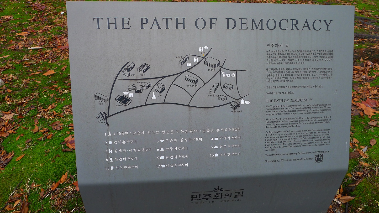 只是同時我也看見,南韓在處理歷史傷痛與轉型正義,比臺灣遠遠積極得多。濟州四三即使不被刻在博物館的牆上,關於它的真相直到今日仍在努力調查中,一位韓國學者李銀珠如此表示:「我們無法稱濟州四三為一個事件,因為在『事件』這個中性用語當中,會有我們尚未發現的歷史,將永遠被埋藏起來。」而在第一學府首爾大學校園內,鋪了一條「民主之路」(Path of Democracy),沿著路線可以看見許多紀念貢獻、喪生於社會改革的首爾大學學生之紀念碑,且直至今日經常還有許多無名人士前來獻花;反觀臺灣大學,卻連陳文成博士的紀念碑也無法立成。在韓國,光州事件的題材可以被拍成MV和由韓流明星主演的暢銷電影,但在臺灣,當我們思考著要尋找什麼大眾媒介能夠介紹台灣獨特的歷史經驗時,想到的還是只有數量稀少的紀錄片與藝術電影。在歷史教育上,在南韓的許多歷史紀念博物館,總是看到小學教師帶著成群的小學生們一一講解過去關於這塊土地的歷史與傷痛,即使許多愛國式的歷史再現方式令我感到難以置信,在臺灣卻是不少人不停質疑臺灣歷史的重要性,以及每逢談起「二二八」、「白色恐怖」,人人總是說:「都過去了,為何一再提起炒作政治?」