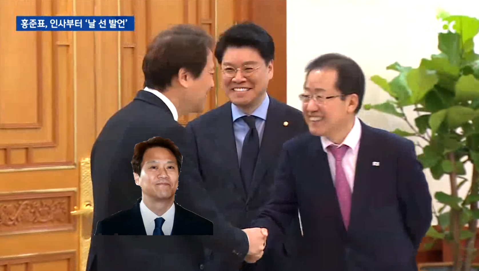 但安熙正落馬後,隔天洪準杓在與朝野黨魁前往青瓦台會晤文在寅總統時,表現出的又是另一種光景。