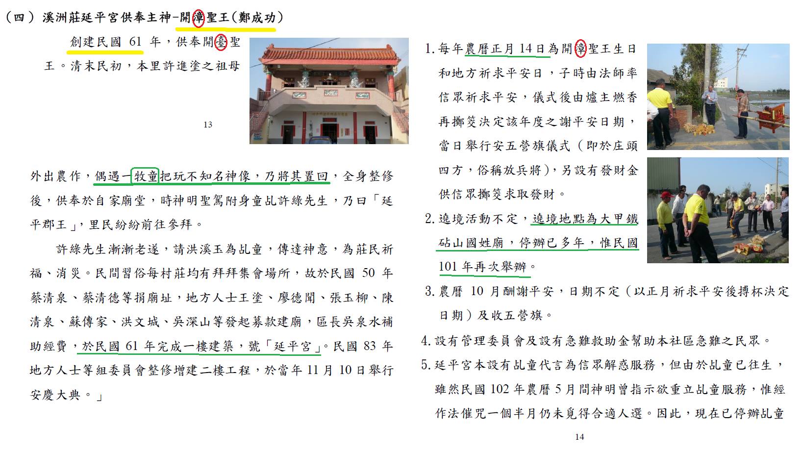 第三,更有趣的是,「開山」、「開臺」並非鄭成功專用語,譬如高雄左營觀音廟,也可以有「開山碑記」。進一步而言,臺灣各地民間「國聖」、「聖王公」等名稱之廟,並不一定全由鄭成功獨攬,廣澤尊王(郭姓王)與開漳聖王,有時也被民間書寫成國聖、聖王公廟。