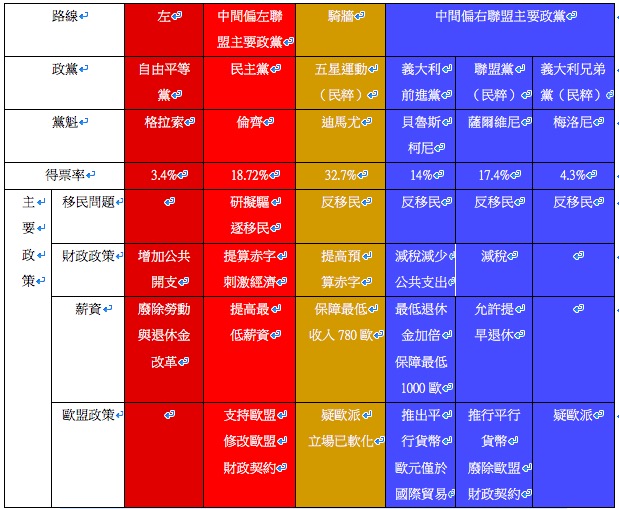 因此,提出全民基本收入780歐元(UBI universal basic income)的政見,加上「反移民」議題的操作,以及推動綠色經濟、政府資訊公開等主張,讓民粹政黨五星運動(Five Star Movement)得以在選舉中一支獨秀,無畏其餘政黨的結盟抗衡。