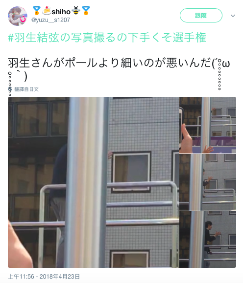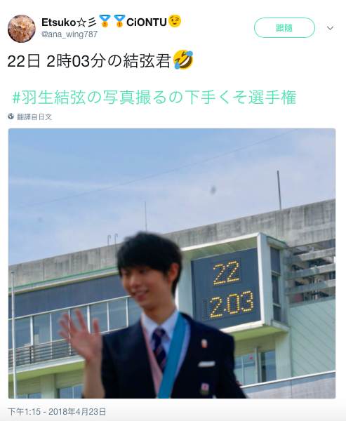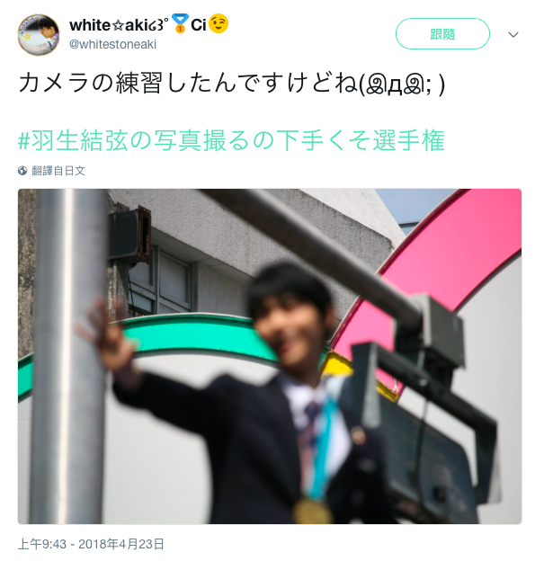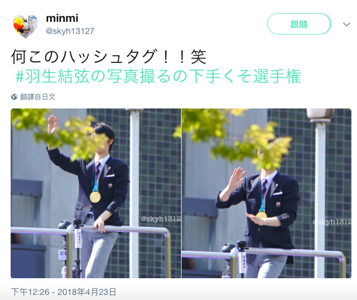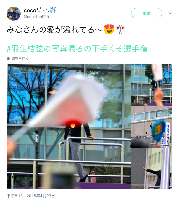 但你會想去現場一睹風采,別人也會想到;你會想要拿出相機,別人也會想到。只是當人擠人時,要拍到一張好照片,難度就增加了,而就算羽生結弦再怎麼親切溫柔,努力回應,甚至發明出360度揮手法(臉面向一邊,雙手則向背後的歡眾揮手),還是沒辦法讓所有人都捕捉到滿意的照片,因此當一夜過去,親見花滑王子的熱情稍事沈澱後,人們打開相機檢查,才發現成果實在不盡人意,於是在日本人常用的SNS管道Twitter上便開始出現了一個熱門tag「 #羽生結弦的失敗照選手權 」(#羽生結弦の写真撮るの下手くそ選手権)。透過大家精準的自嘲與吐槽,彼此「取暖」,竟也反轉了這份失落之情。