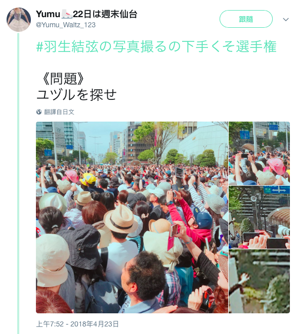 超過10萬人的圍觀群眾,光用想像就知道當天的遊行路線多麼人山人海,羽生結弦雖是居高臨下站在車上,但人們不是高舉國旗就是揮舞雙手,怎麼拍都會被大擋特擋一番。有網友當天拍的照片,羽生選手不是被旗子遮住,就是被柱子擋到,不禁感嘆羽生選手居然比竿子還要瘦,甚至有不管怎麼拍都只拍到一堆民眾的人,自暴自棄般上傳了拍攝的照片,無奈地寫上「《問題》找出結弦」,直接上演「威利在哪裡」的羽生選手版。
