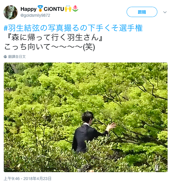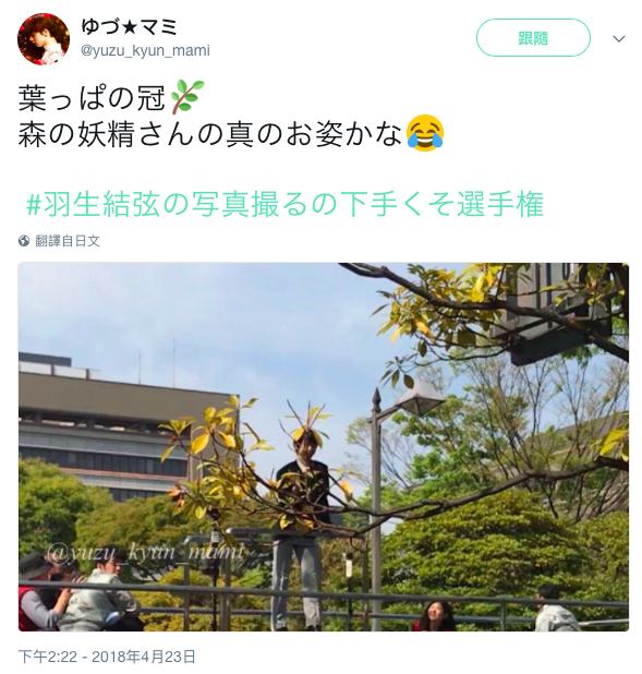 都市中保持綠意,是一份值得自豪的驕傲,不過放在羽生結弦的凱旋遊行活動中,花草樹木全成為敵人。有些人按下快門的瞬間,羽生結弦恰巧就經過了行道樹,照片一拍葉子就彷彿成了桂冠,讓網友無奈地評論拍下了「森之妖精的真實姿態」呢,甚至還有人拍到幾乎被樹叢所掩沒的羽生選手,忍不住吐槽簡直捕捉到了「回歸森林的羽生先生」。
