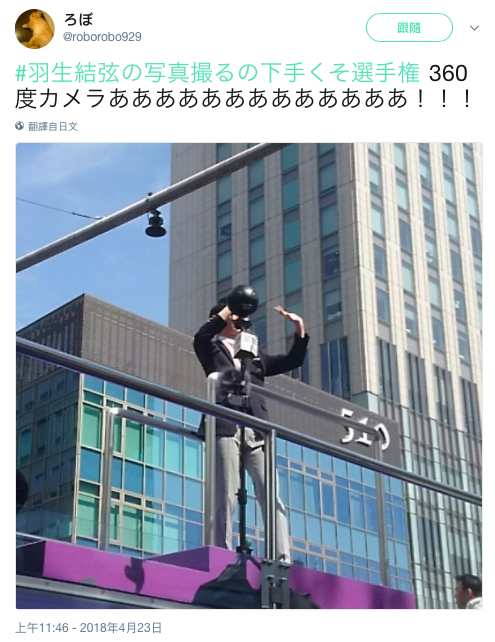 這次的凱旋遊行有NHK全程轉播外加各家媒體大陣仗應對,無法到場的粉絲可以在電視中、網路上一睹羽生結弦的風采,甚至為了增加臨場感與視線寬度,遊行車上架了一台360度攝影機,沒想到這台攝影機,竟也成為讓現場民眾恨透的礙眼傢伙。因為站得稍近的民眾若一仰角,羽生選手精緻的小臉就會完全被圓形的攝影機給完美遮蔽,讓拍下殘念照的網友忍不住仰天大吼。