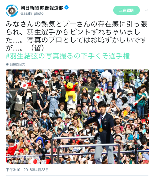越「殘念」、越笨拙的照片,就越爆笑、越療癒,成為這次羽生結弦凱旋遊行中最精彩的番外篇。就連朝日新聞的攝影記者都來「專業」踢館,在報社影像報導部的官方Twitter帳號中貼上一張失敗照,說就連職業是攝影的專業人士,「都不自覺被民眾的熱情與小熊維尼的存在感給拉了過去,讓羽生選手失焦了」,一塊共襄盛舉。所謂攝影的權威性與技術層面,在這個新聞現場中,似乎也沒這麼嚴肅了,那些主角失了焦、臉被擋、甚至連人在哪都找不到的照片,透過人們的共同參與激起另一種趣味與熱度,編織出一條可愛又歡樂的支線劇情。