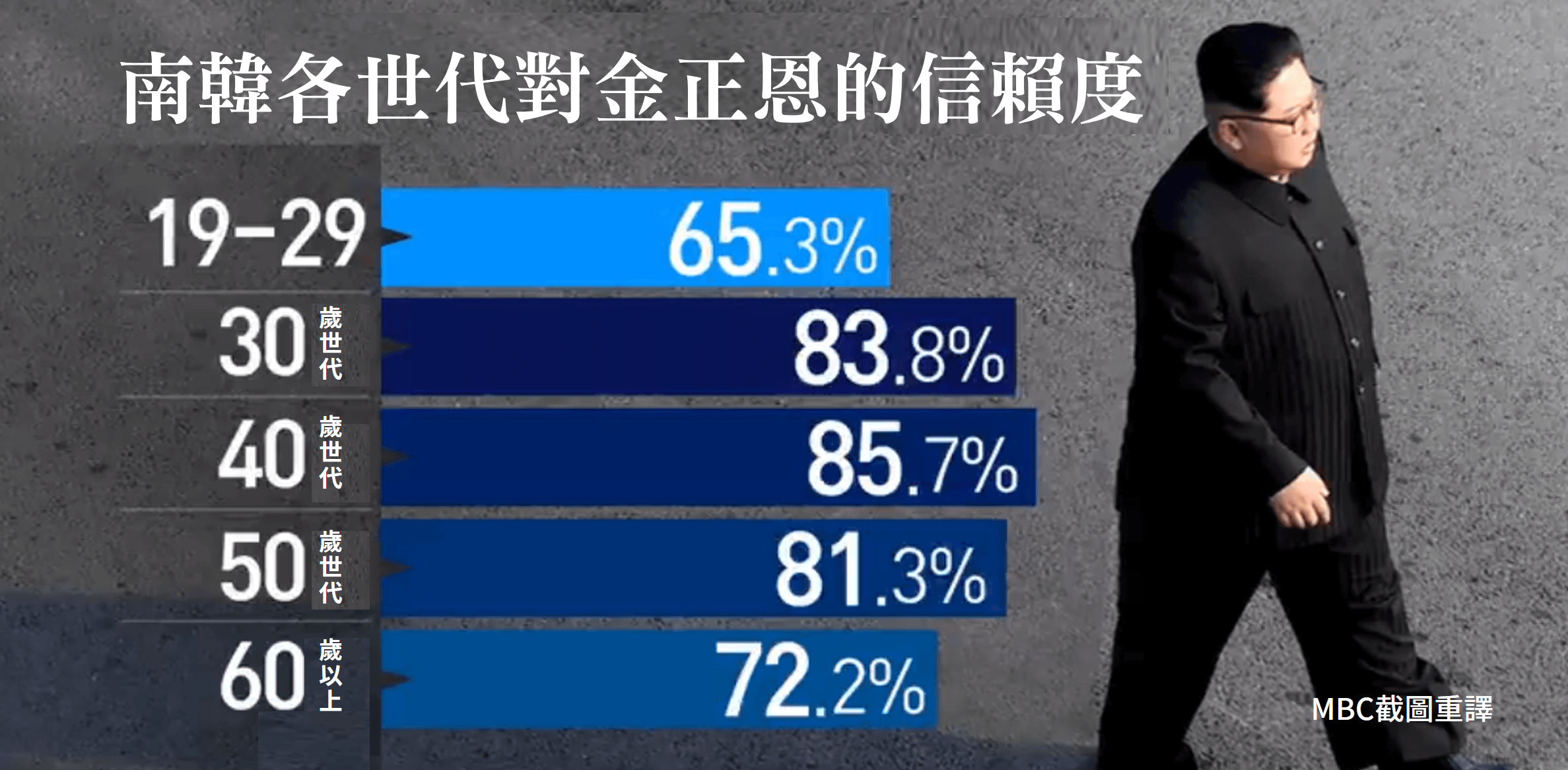 值得注意的是,MBC電視台委託的民調顯示,峰會後,30-50歲世代的南韓民眾,對金正恩抱持高度信任;CBS廣播電台的民調更顯示出極大反差:在峰會前,有78.3%的民眾對北韓抱持不信任的態度,在峰會後,卻有64.7%的人表達「信任北韓」。