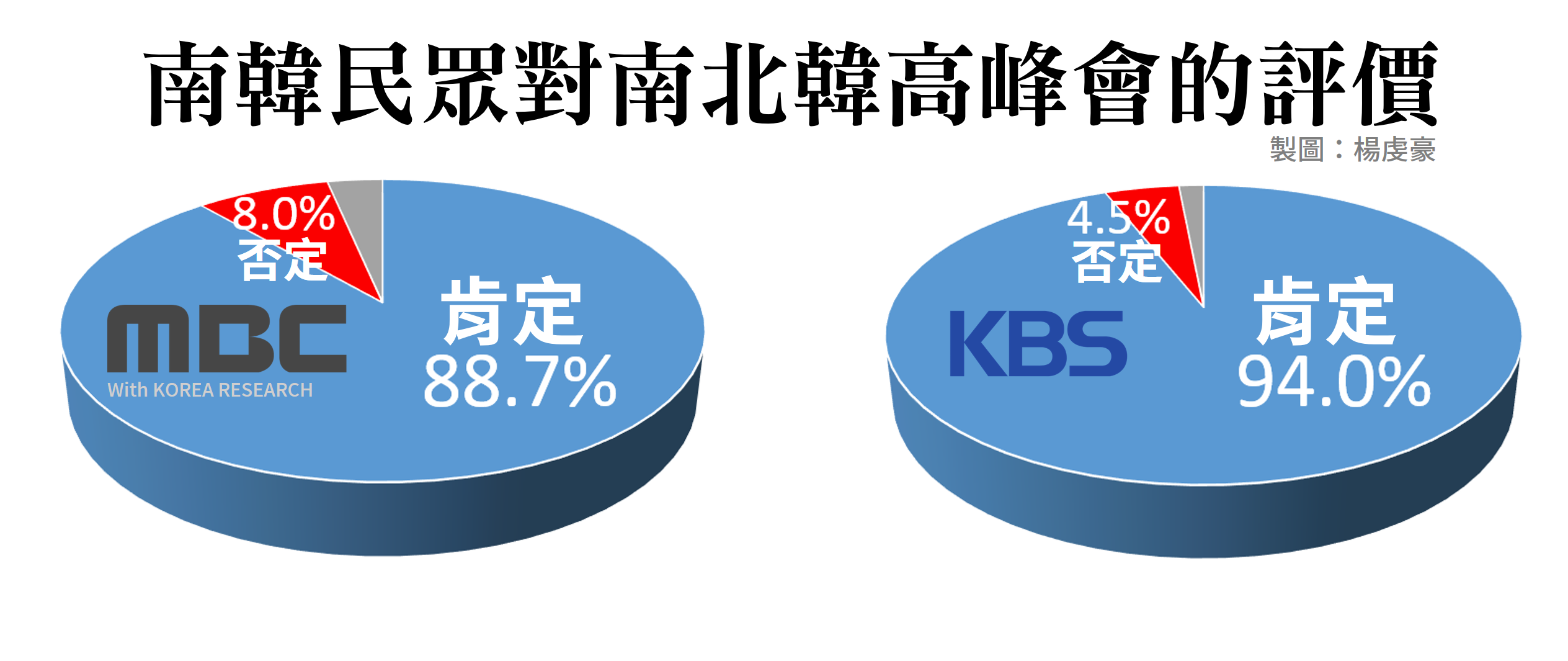 峰會結束,南韓主要媒體委託施測的民調結果顯示,絕大多數民眾,都對文金會給予正面評價,認為兩人見面已可視為突破,這將成為韓半島走向和平共存的契機。