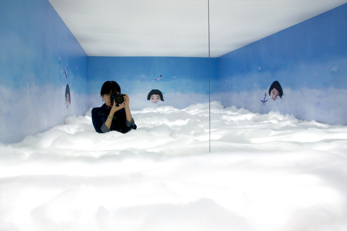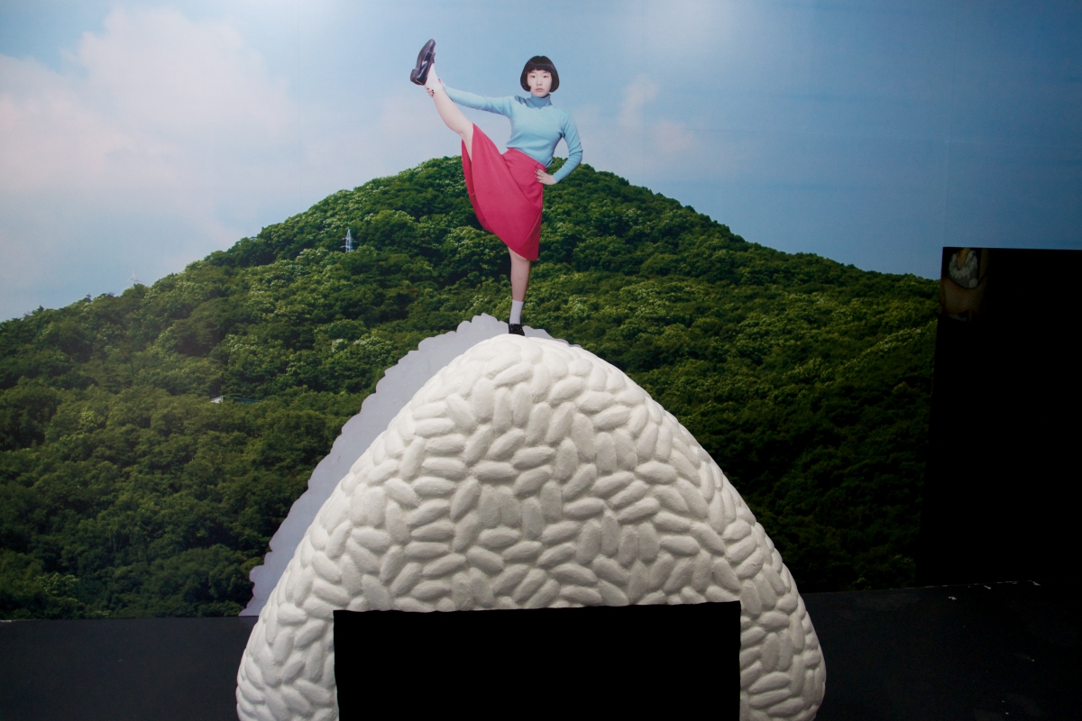 感受美的經驗、碰上珍貴瞬間時,很多人一定都有想按下快門的衝動,近年來,日本越來越流行使用Instagram,甚至「曬Instagram」(インスタ映え,インスタ為Instagram的日文簡寫,映え可解釋做「映える」,指的是映照、照耀的意思,也可延伸作好看、閃耀之意)一詞還獲得了2017年流行語大賞。舉辦攝影祭的人自然也很懂這份心情與趨勢,因此除了限制一些作品禁止拍攝之外,大部分的展場都能拍照,比如說開頭提到的宮崎いず美展覽,就在門口放置了攝影師於自己作品裡也用到的「巨大飯糰山」模型,供參觀者拍照留念,3樓展覽空間也架設了一個拍攝空間,只要把頭伸進挖空的洞中,就能讓自己進入到「雲朵空間」裡,輕鬆拍出超適合「曬Instagram」、洋溢著宮崎いず美奇想風格的照片。