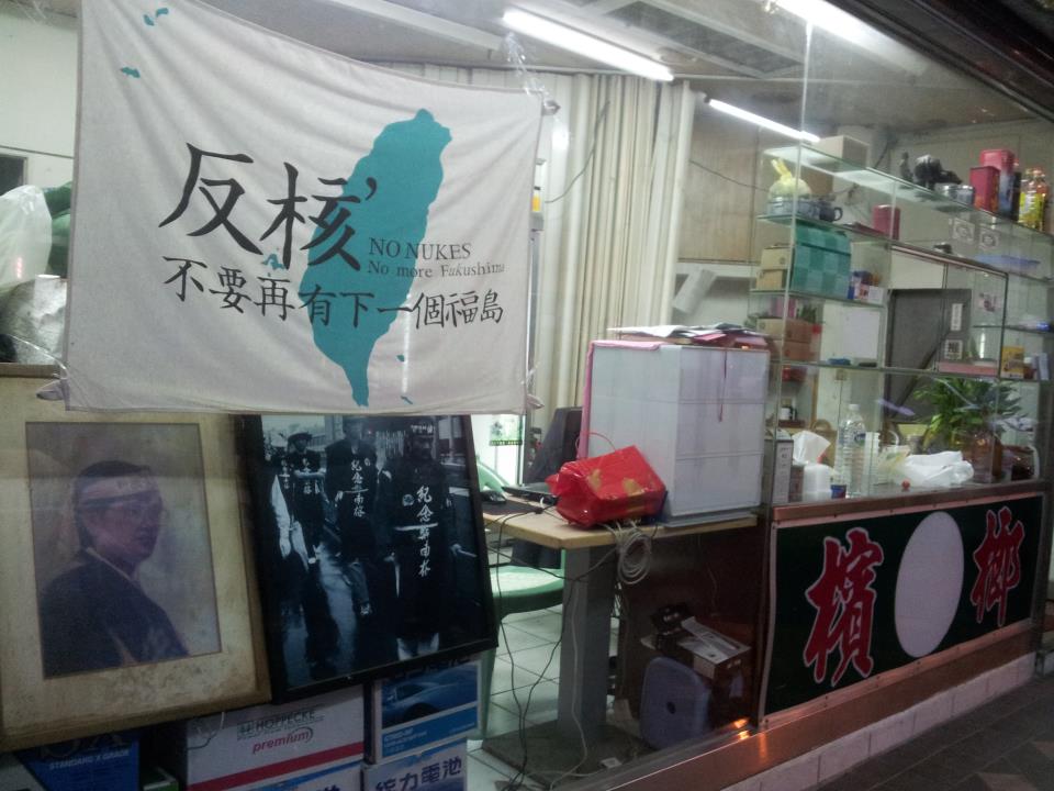 晚上經過萬華一家檳榔攤,玻璃窗掛上了反核的旗幟,我對這面時常見於文青咖啡館、文青書店的旗子並不陌生,但這裡是「檳榔攤」。我停下來,旗子下有兩張照片,一張鄭南榕的畫像,一張鄭南榕出殯時的照片。