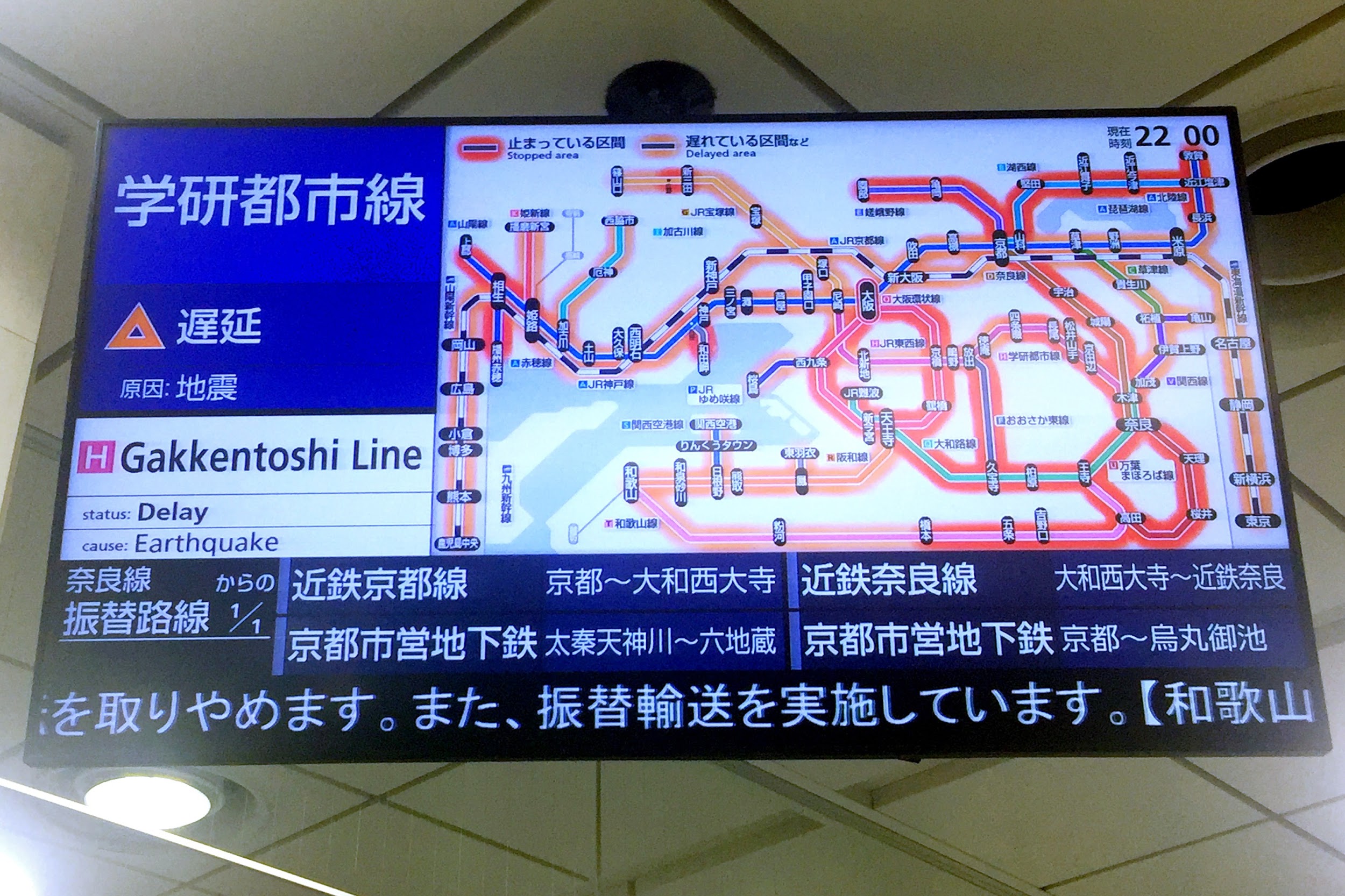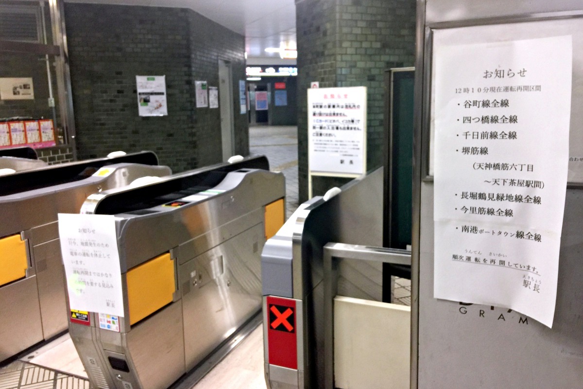 不過在沒看見的地方,仍有許多被影響、待檢查的工作要進行,第一個要面對的課題就是「交通」。新幹線、JR、大阪地下鐵全面停駛,時逢上班通勤時間,大批的上班族都被困住了,路上也擠著許多提著行李箱的外國旅客,有一部分人選擇默默等待,另一部分人則是相信雙腳萬能,持續向各自的目的地前進。