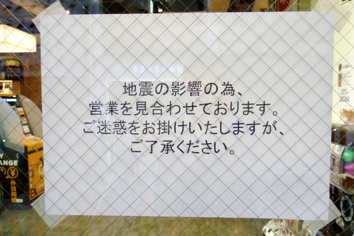 持續往目的地前進,我走到了大阪的購物勝地心齋橋、道頓崛一帶。為了方便外國旅客購物,總是開得特別早的藥妝美妝店,這天都為了整理店舖而反常地拉上鐵門,延後開店時間,或是直接當機立斷貼上了「由於受到地震影響,本日暫停營業」的告示。轉了一圈進到速食店休息,想喝杯可樂為自己打打氣,結果換來了店員歉疚的苦笑:「客人不好意思,因為地震的影響,碳酸現在打不出來......。」沒車坐和沒飲料可喝,這些是僅僅發生在我身上,再微小不過的小插曲,直到有餘裕刷訊息時,才發現災情比想像中要嚴重許多,甚至傳出了遺憾的死傷消息。收起輕率的心情,但不驚慌與保持冷靜,仍是最必須抱持的態度。