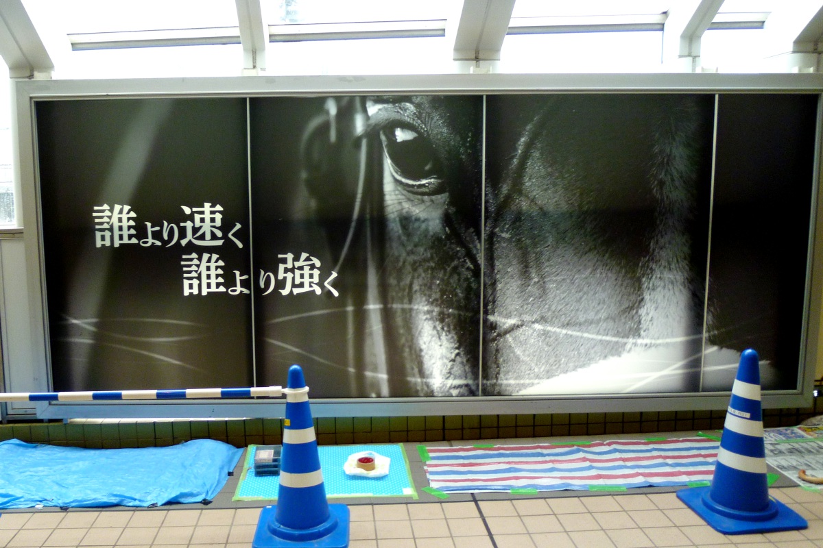 有人抱持著快速致富的心情踏入賽馬場,有人喜歡投身於速度競賽的快感中,但現代賽馬場所能提供的,還有更多更多。那一天的賽馬場初體驗,是從東京賽馬場附近的車站「府中本町」開始的。一下車,就發現許多腋下夾著賽馬報紙的人都朝著同樣的方向前進,筆直的專用天橋直接通往賽馬場的入口,兩邊都是賽馬們的海報,有些捕捉下毛髮飛揚的一刻、有些是奔馳向終點的瞬間,還有一張僅特寫了炯炯有神的馬眼,配合著簡單的slogan「比誰都要快速,比誰都要強大(誰より速く、誰より強い)」,帥度實在破表,眼神掃過一張張海報,讓接下來得以親見真馬的興奮感也默默升高。