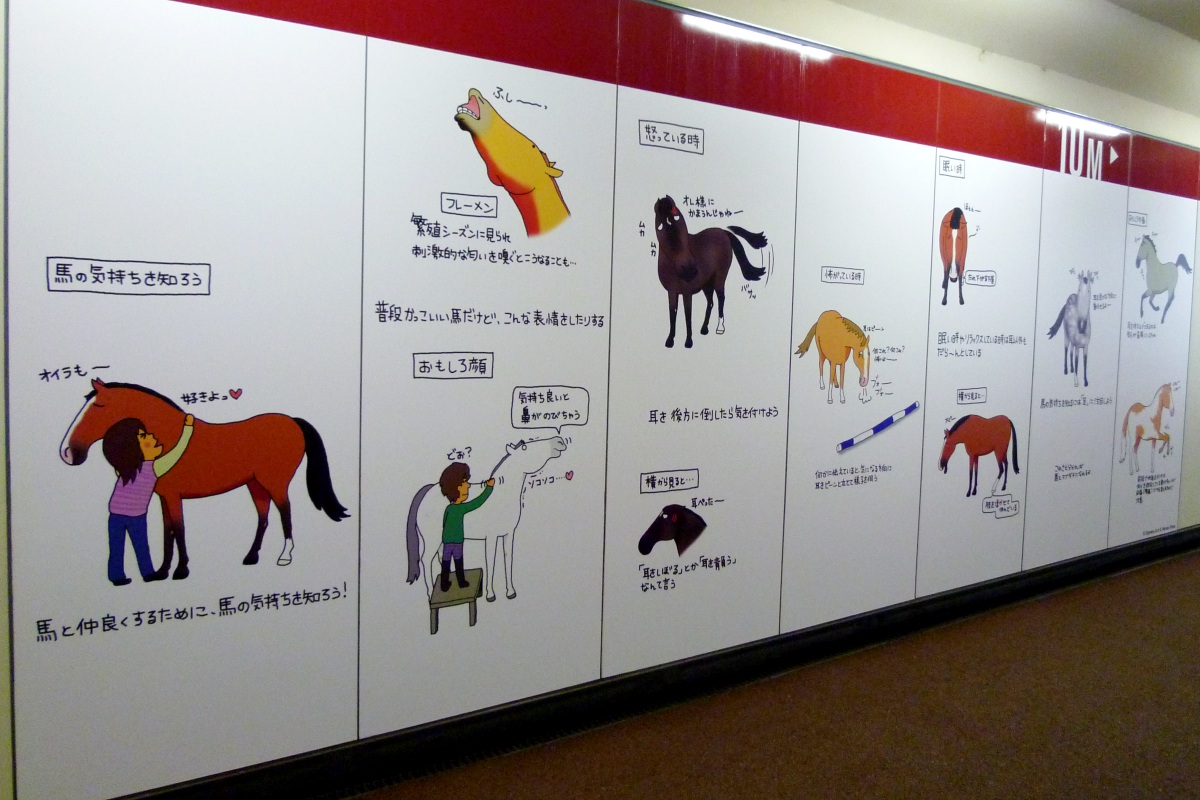 付了200円入場費後,首先映入眼簾的就是遼闊挑高的看台與賽道,東京賽馬場之大,甚至像是一座遊樂場,不僅有公園、花圃、小吃攤販,還會不定期舉辦乘馬體驗,或是看懂賽馬報紙的簡易教學,就連聯通隧道都繪製了卡通版的賽馬小知識,像是馬兒的成長史,或者如何從馬的動作舉止來判斷牠現在的心情,而這些小常識又能利用在可以近距離觀察賽馬狀況的賽前圍場,對於老江湖的馬迷來說也許沒多大意義,但對初來乍到的我或者年齡層較低的來客而言,卻能感受到這份體貼與親切,遑論圍場邊拿著大砲鏡頭只為捕捉馬兒英姿的攝影者有多多了。