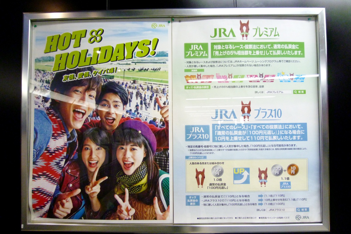 事實上,為了激起年輕人對賽馬的興趣,JRA在宣傳面也鋪陳了許多故事,他們找來松坂桃李、柳樂優彌、高畑充希、 土屋太鳳等新生代演員代言,以一群好友一塊兒度過「HOT HOLIDAYS!」為主題,除了傳達賽事令人熱血之外,也表明就算是賽馬初心者,也能抱持著輕鬆的心情踏入賽馬場。今年6月24日於阪神賽馬場舉辦的「寶塚記念」賽事,還請來傑尼斯偶像團體關8的成員錦戶亮、村上信五與橫山裕來齊唱國歌,都為賽馬活動添增了一絲活潑歡樂的氣息。