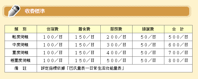 療養院不僅免費照護窮困病患,就算是自費養護,費用也是非常親民,點開療養院的網站,清楚地羅列收費標準,從輕度倚賴到極重度倚賴,每日的費用都不到一千元。