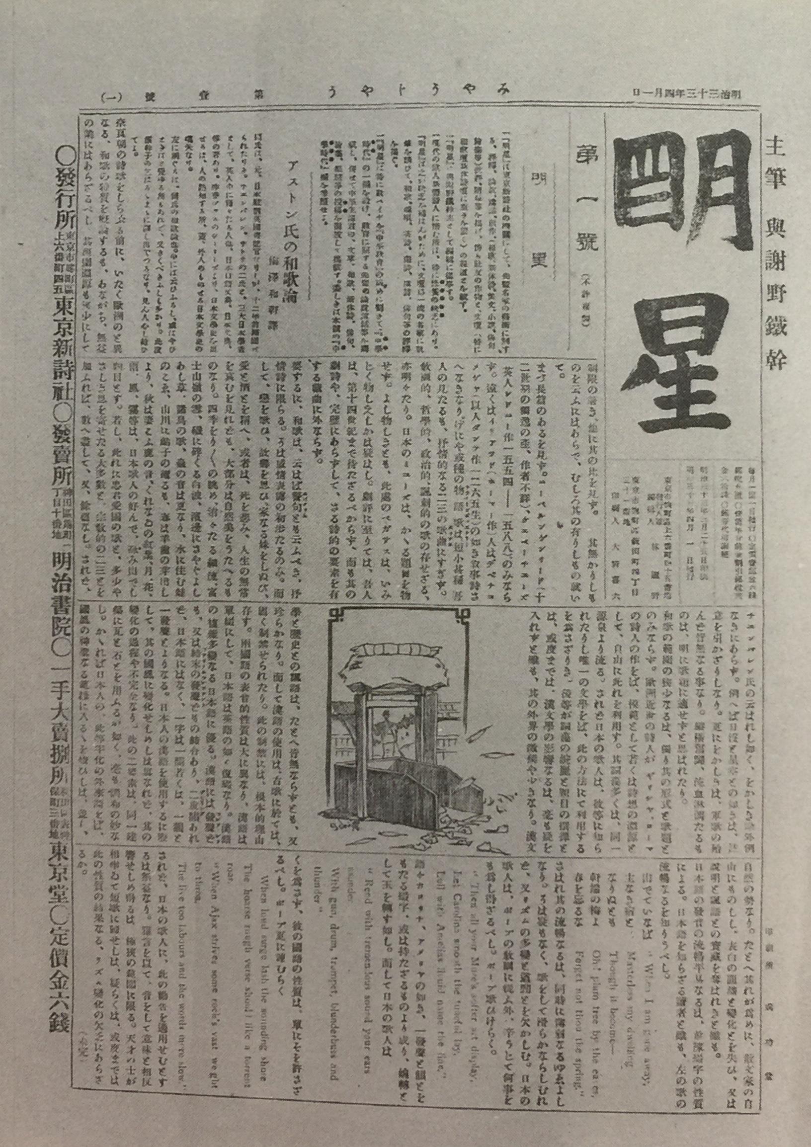 1900年(明治33年)4月1日,詩人與謝野寬(鐵幹)創刊《明星》雜誌,剛開始,這份刊物為小型報紙的對開版,同年8月發行到第5期,仍然沿用這個版型,第9期則改為32開,到了1908年(明治41年)11月,共計發行了100期,才宣布停刊。從雜誌的發展史來看,與謝野鐵幹的《明星》能撐持到100期,實在不容易,何況在掙錢困難的時代裡,創辦理想的雜誌絕對是奢侈的行為。