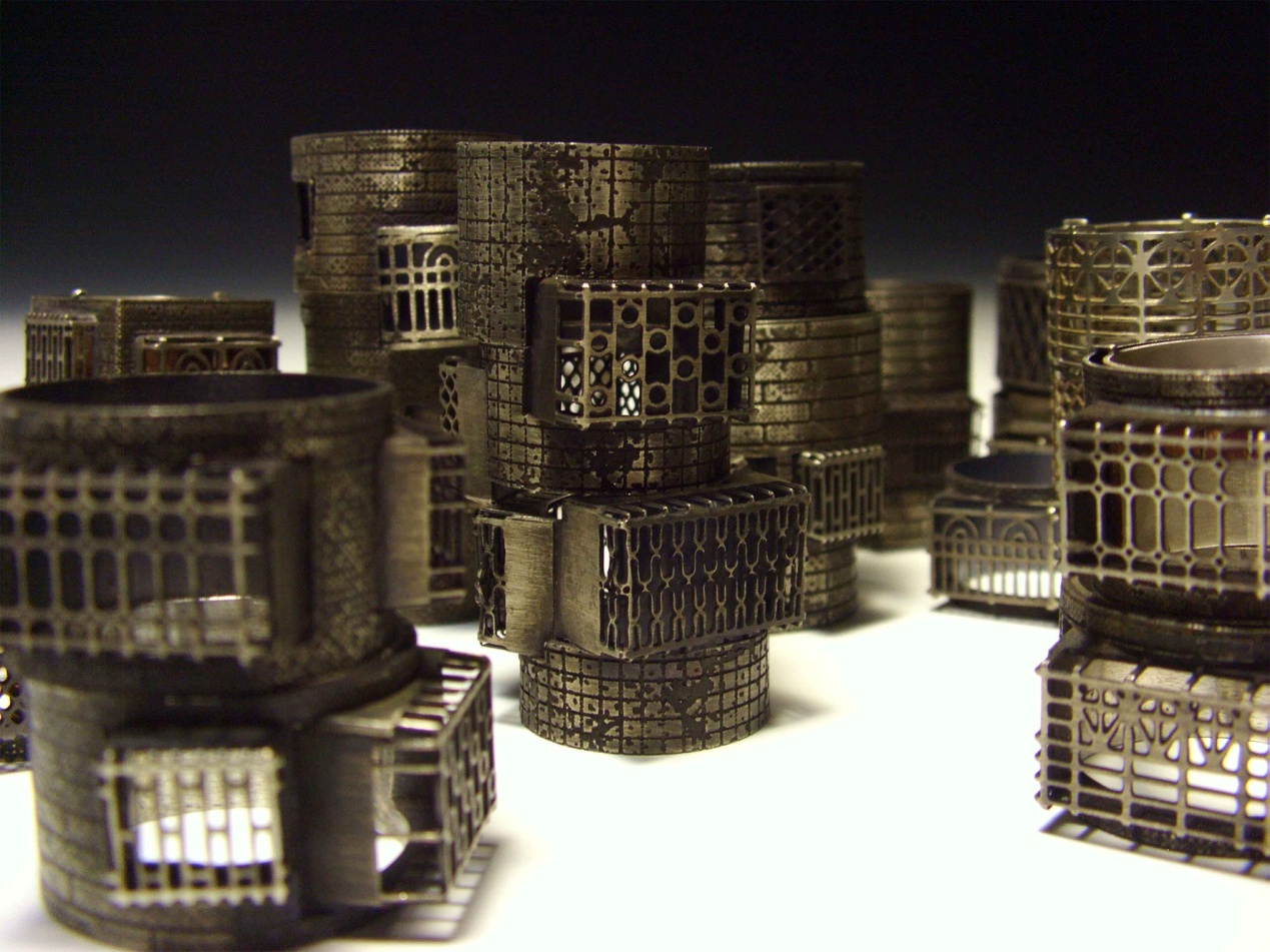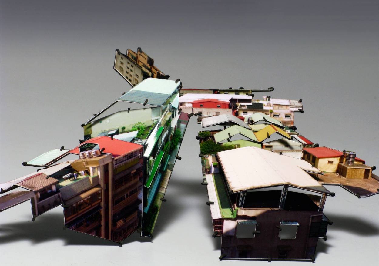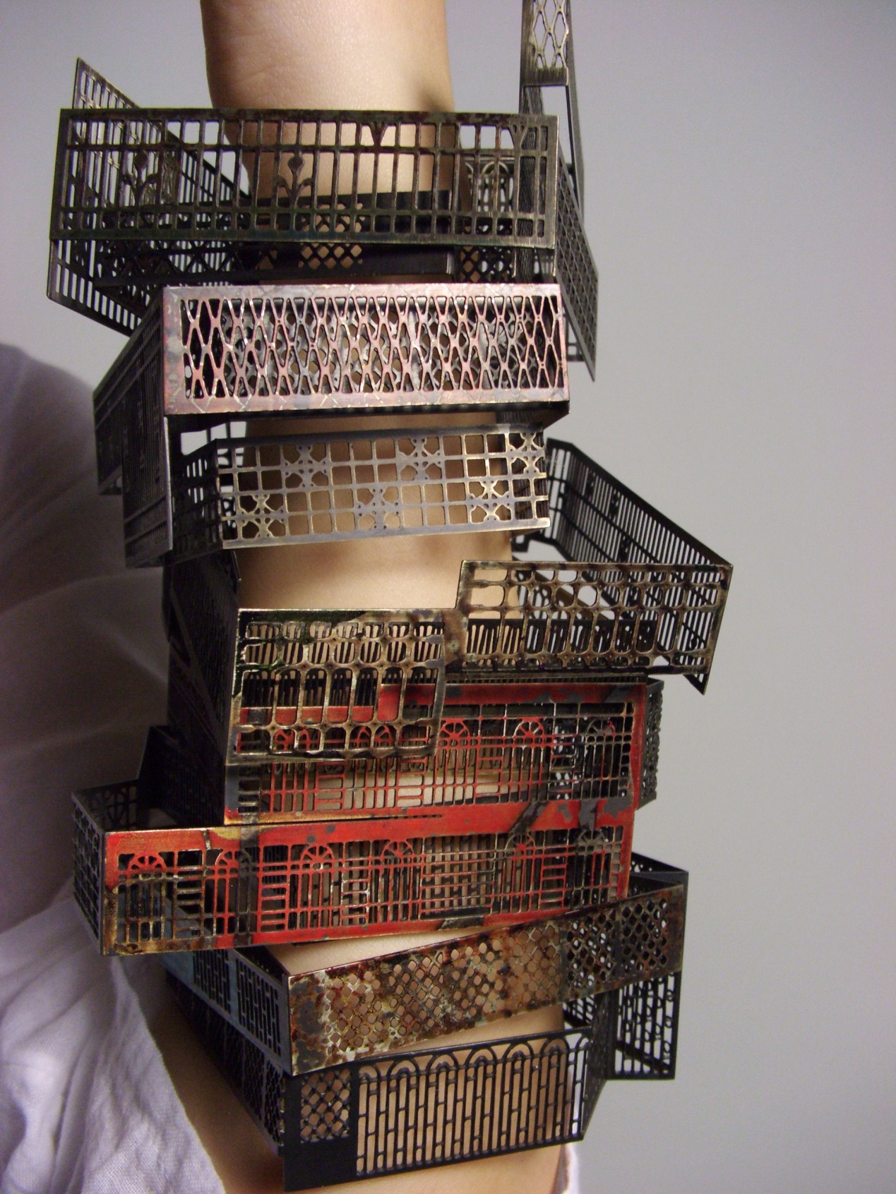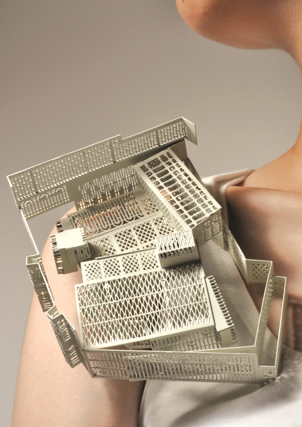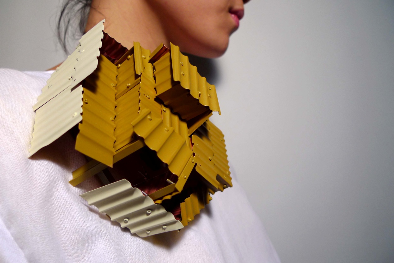 她開始嘗試著將這些觀察運用在首飾創作裡頭。起初,她嘗試著將鐵皮屋的照片照自己想法剪開重新拼貼,加上金屬做立體支撐,組裝成她心中的住宅。