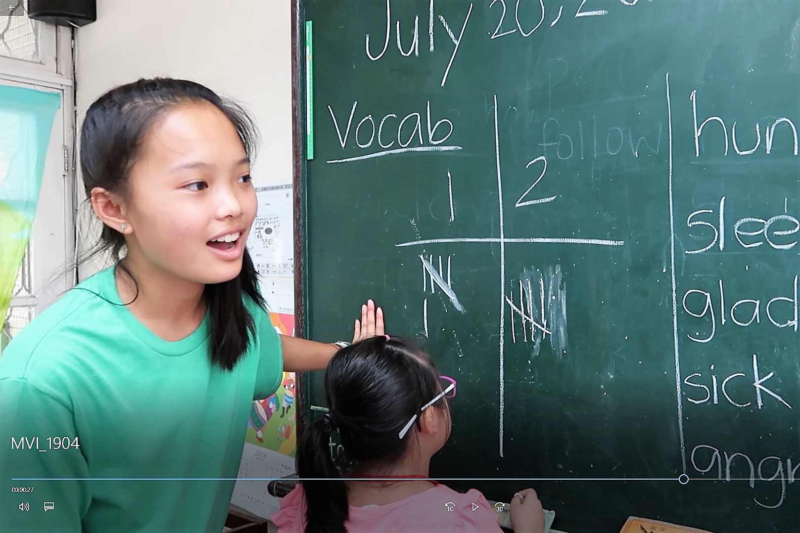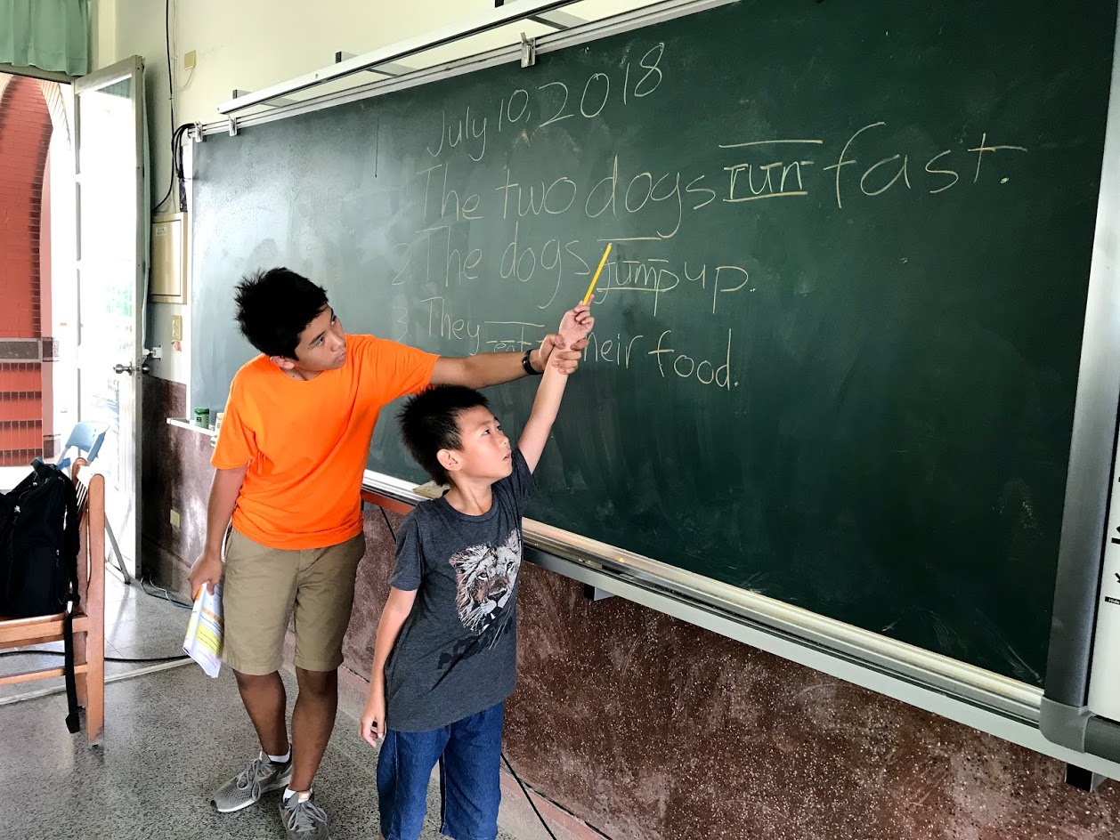 這次來台教學的學生共有八位,剛好是四男四女,年紀最大的是15歲女孩Katie(梁嘉怡)與男孩Ian(關景鴻),其他有14歲男孩Aidan(李中杰)、13歲男孩David(陳仁杰)、12歲男孩Anthony(梁嘉進)、12歲女孩Gillian(關智蓮)、11歲女孩Jacqueline(蔣菱),以及年紀最小的6歲小女生Janie(蔣荃),我們可以看到,即使最小的6歲小妹妹,也是很認真的在教人唸英文、寫英文。其中大姊姊Katie,是我2014年就認識的小女孩,那年她才11歲,我還記得隔年暑假,她被台美老師帶來台灣,團體旅遊後,我們在內湖咖啡店商量平等國小孩子要去美國表演布袋戲的計畫,討論結束後,她就被台美老師要求在騎樓下,對著馬路開始背誦英文主持人講稿,那個講稿,正是我們即將去美國表演時的開場白,那時我就非常敬佩台美老師的訓練方式,果然之後我們在美國演出,由美國小孩為我們用英文介紹出場,獲得觀眾很大的肯定。沒想到一晃眼,Katie現在已經是高中一年級大姊姊了,今年夏令營快要結束時,我特地訪問她,已經連續四年來台灣教英文的心得感想,她說: