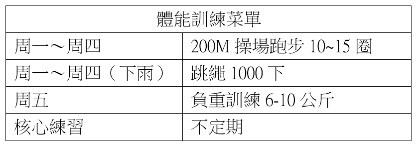 這份體能訓練的菜單是練習到最後的成果,其實從五年級上學期開始的體能,我僅要求學生從操場跑步三圈開始,約略每個月增加一圈,不參加爬山的學生到最後停置在每天跑10圈操場,而爬山的學生則慢慢增加至15圈。這樣看似緩慢增加,但是這種「溫水煮青蛙」不知不覺訓練法,卻可以讓學生們的練習長長久久。為了帶著孩子們上山,筆者也必須不斷增進自己的體能以及相關的登山知識才足以滿足學生們的學習欲望: