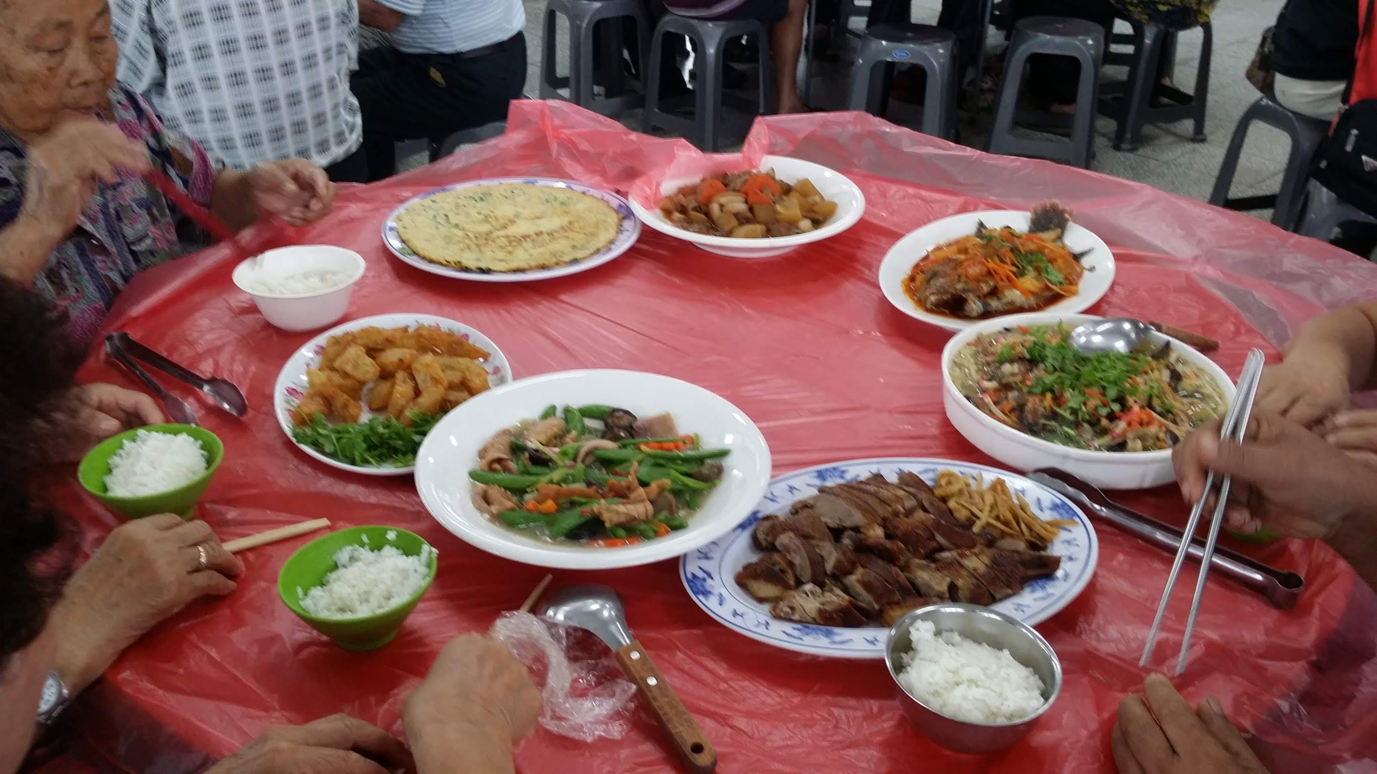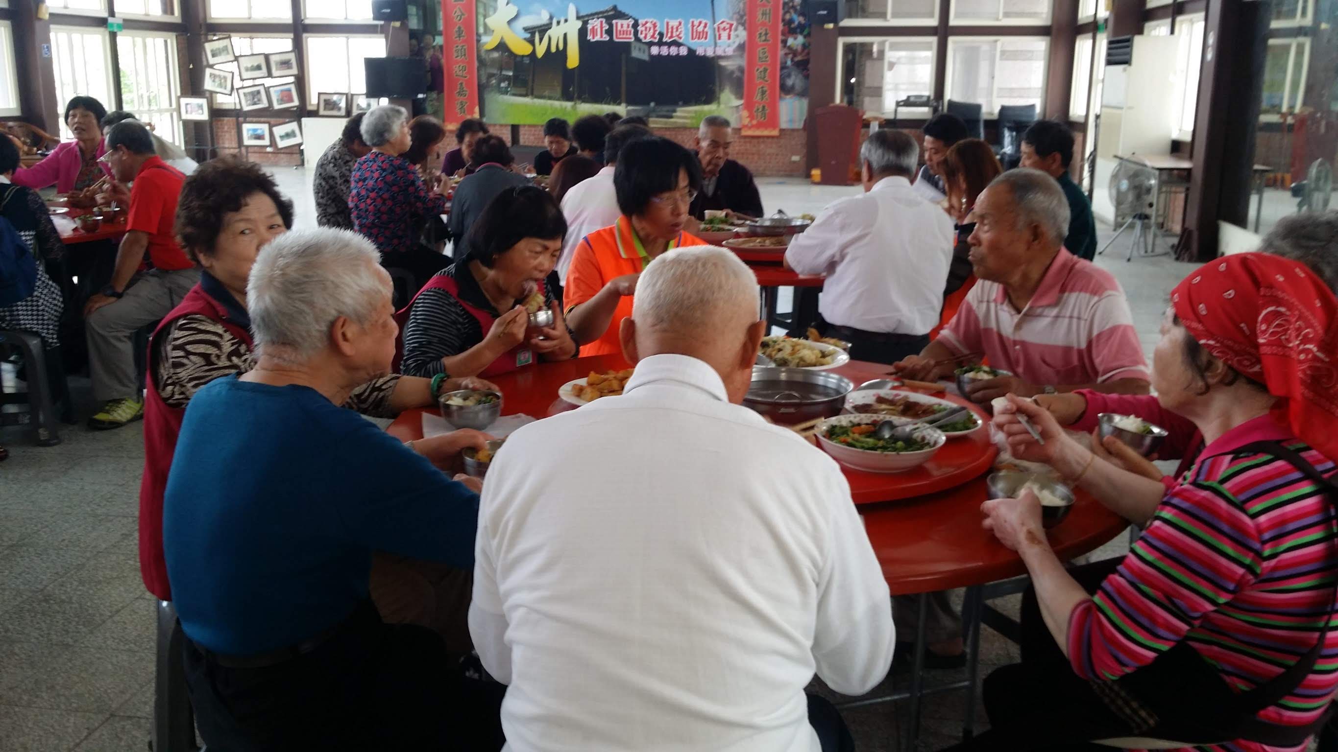 再往村子巷子裡走,會來到一間多功能建築館,每天在這個空間裡,聽說都會有不同的活動與團體在運用著,如土風舞班、元極舞班,有氧舞蹈班。比較特別的是,已經服務快四年的村長說,他們在103年就成立了「長青食堂」,也就是週一到週五,村長號召志工,來這裡幫忙煮午餐,邀請社區老人家一起來共食,一方面一起吃飯很熱鬧,一方面也可以就近照顧老人家、關心老人家,如果是低收入戶的老人家,可以免費食用,一般老人家則酌收一餐40元。目前會來這裡共用午餐的老人家,大約有30位,另外約20人,會請外傭或鄰居,幫忙包便當拿回家吃。至於假日為什麼不供餐呢?因為希望假日的時間,老人家可以跟自己的家人共進午餐,假日時年輕人休假了,也希望可以多多陪老人家吃飯。