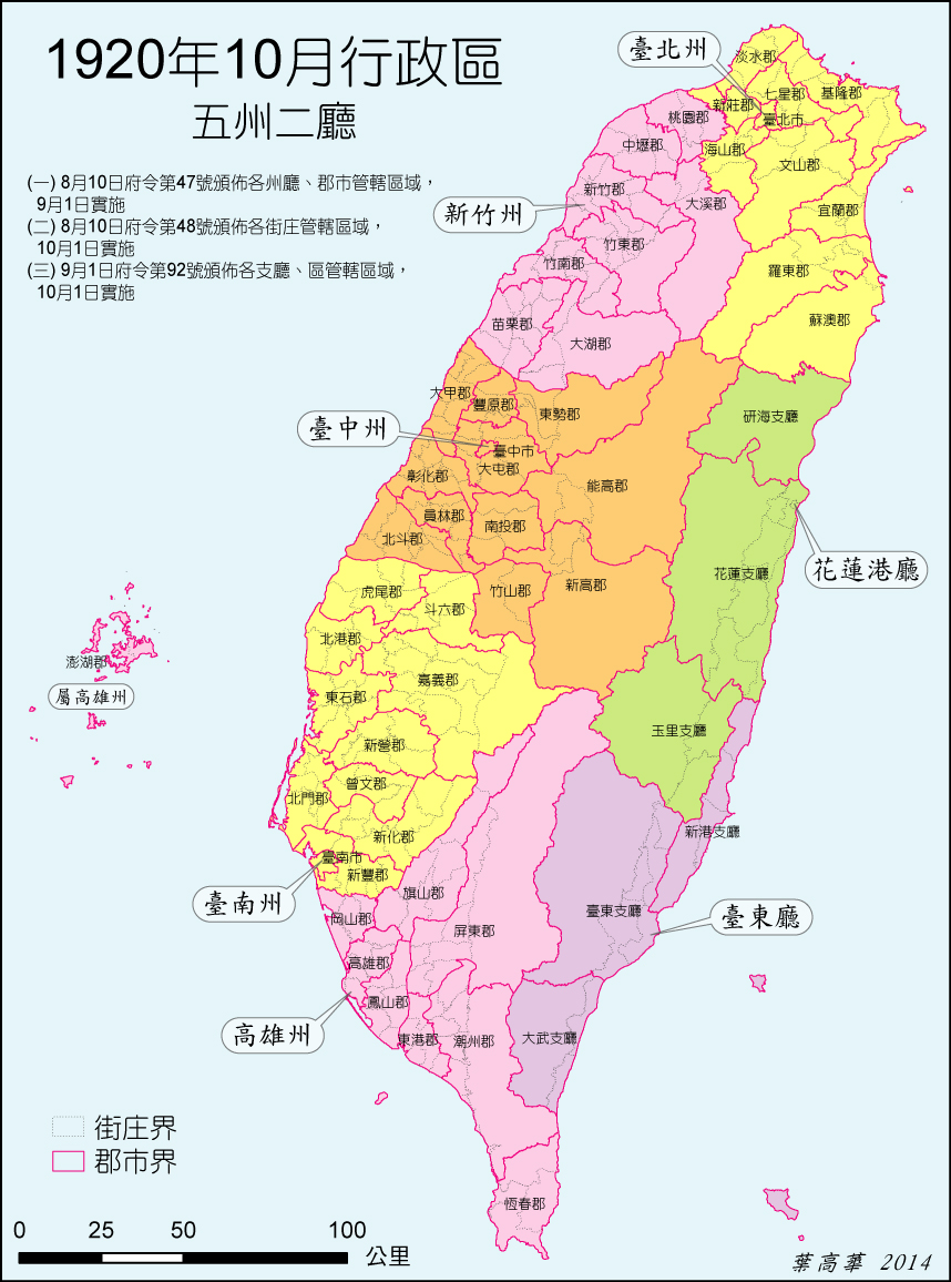 日本人制訂的五州二廳制,以現在的行政區域角度,也是非常科學的的劃分法,目前台灣行政區劃大多繼承1920年的劃分方式。