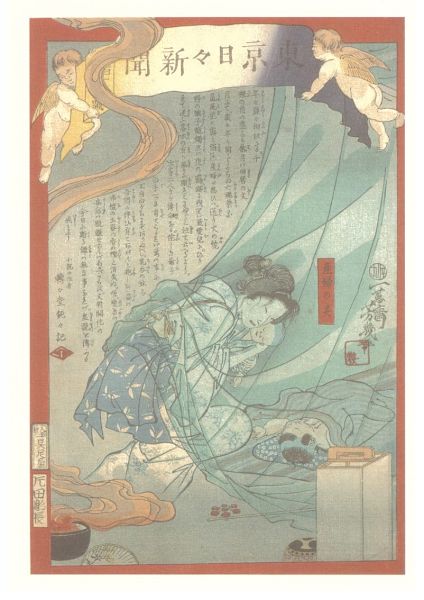 明治前後的浮世繪師多身兼數職,最主要原因在於隨著照相的出現,照片搭配明信片漸受流行,相形之下,浮世繪多少受到衝擊。與此同時,報紙如雨後春筍ㄧ般冒出。有趣的是,日本報紙發展的繁盛,與明治政權之初幾件大事相關。一是西南戰爭,西南戰爭的背景是西鄉隆盛原是明治維新功臣也是明治政府要員,但因意見不合,最後回到家鄉並成為反政府力量,一八七七年明治政權發動征討,這是日本最後一場內戰,渡邊謙主演的《最後的武士》(二00三)就是以西南戰爭為背景。人們因關心戰事發展,因而讀報報紙銷售量也因而大增。第二則是要求開設議會的自由民權運動,在這個歷時十多年的運動裡,宣傳理念成為要務,演講與報紙成為眾聲喧嘩的平台。