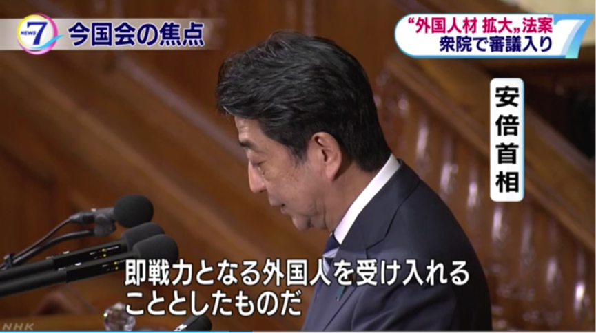 安倍內閣在日前(11月2日)通過出入國管理法的修正草案,預計成立新的在留資格,將外國人的就勞資格的發放對象從「高度人才」擴大到「單純勞動者」,期待透過外國人勞動者的「即戰力」來緩解目前勞動市場的人手不足。雖然政府始終避開「移民」這個詞彙,但在野黨人士則質疑,這個政策改變了日本過去堅持不開放單純勞動力的原則,在配套措施還未制定、新法的內容也不明確的狀況下,目標明年四月施行,實在過於倉促。連向來支持安倍政權的產經新聞也批評,未來部分勞動者將有機會獲得永住權,包含其家族在內的社會保障制度以及工作都會影響日本社會,需要更慎重討論。而安倍首相的回應,則是維持一貫「政府沒有要採用移民政策」的說詞。