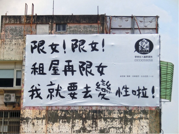 上述這些例子中,後二者因《性別工作平等法》的實施,若經檢舉則須開罰,但第一個例子尚且無法可管。一旦這些針對性別的傳統刻板印象,不加思索地直接置入人人可見的公領域,對擁有這樣特質或屬性的人而言,光是看見就可能造成傷害與否定:「因為我是男的,所以我就是可能侵犯女房客或女學生的潛在加害者嗎?」、「因為我是女的,所以費力的工作我就無法應徵嗎?」、「因為我的氣質陰柔,所以就比較容易被排拒在外嗎?」
