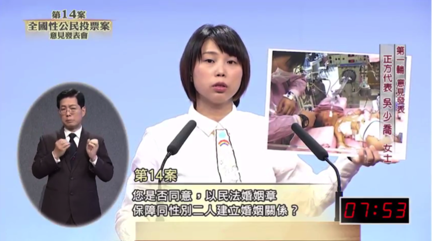 然而,並不是所有人都有辦法順利成為媽媽。本次選戰合併了五個與婚姻平權直接或間接相關的公投。在本次婚姻平權的意見發表會中,同志家庭權益促進會的女同志媽媽吳少喬在電視上,顫顫地、卻也平淡而堅定地講述自己的故事。自己的女兒,在出生之後隨即因為先天因素送入新生兒加護病房,她的伴侶卻因為不具備家長身分,而無法立即安排手術。等到吳拖著剛生產的身子,從桃園趕到台北簽下同意書,女兒卻因為手術延誤,肺破了兩個大洞,必須面對更險峻的風險。九死一生撿回一命的女兒,有次看到自己背上的刀疤,天真的問,「這兩個疤痕,是不是代表媽媽不能保護我?」她只能充滿虧欠地回答:「不是媽媽不想保護你,而是這個法律不夠好,我們不能保護你。」有些人透過展示或操作媽媽的身份來贏得選舉;有些人卻必須透過選舉來爭取自己媽媽的身份。