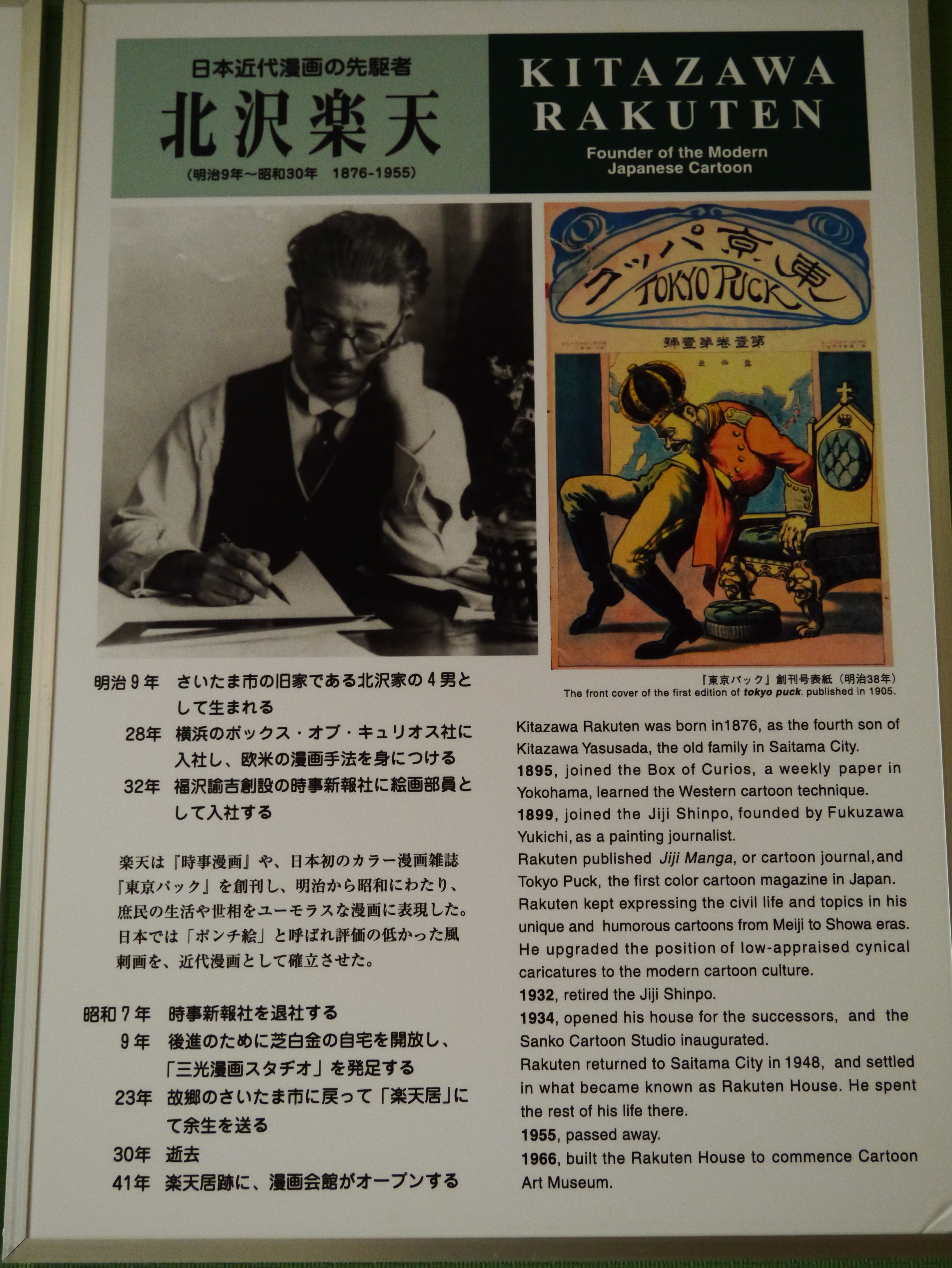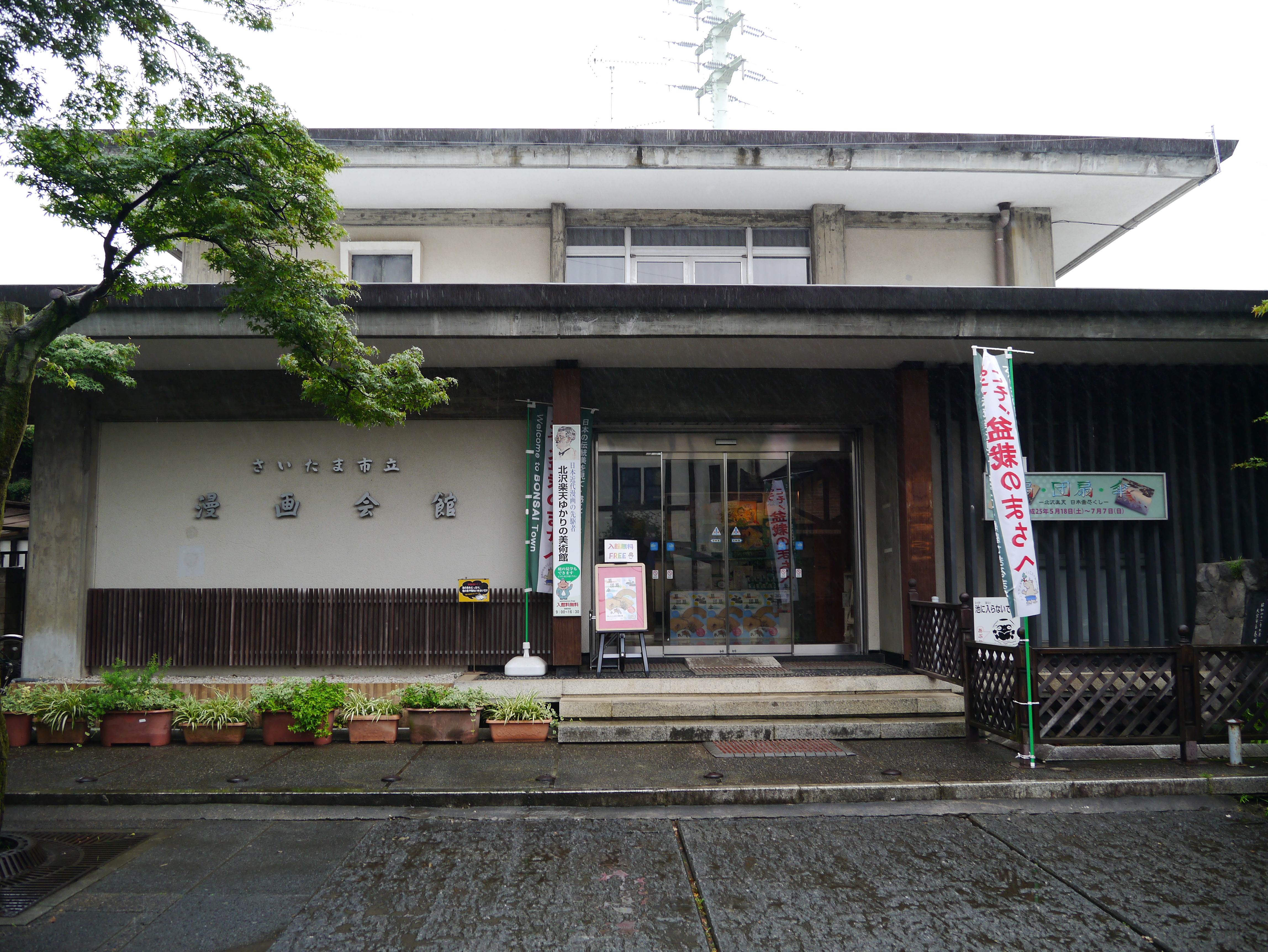 北澤樂天漫畫會館位於大宮的崎玉市浦和區,這裡以盆栽著稱。從東京搭新幹線到大宮再轉電車進入浦和區,從大都會到小町,從喧囂到寧靜,別有一種適切的安靜感。進入漫畫會館,映入眼簾的便是簡介北澤樂天的幾幅大型漫畫。最引人注目的,莫過於福澤諭吉對北澤樂天的教誨:「漫畫也有大用處!」