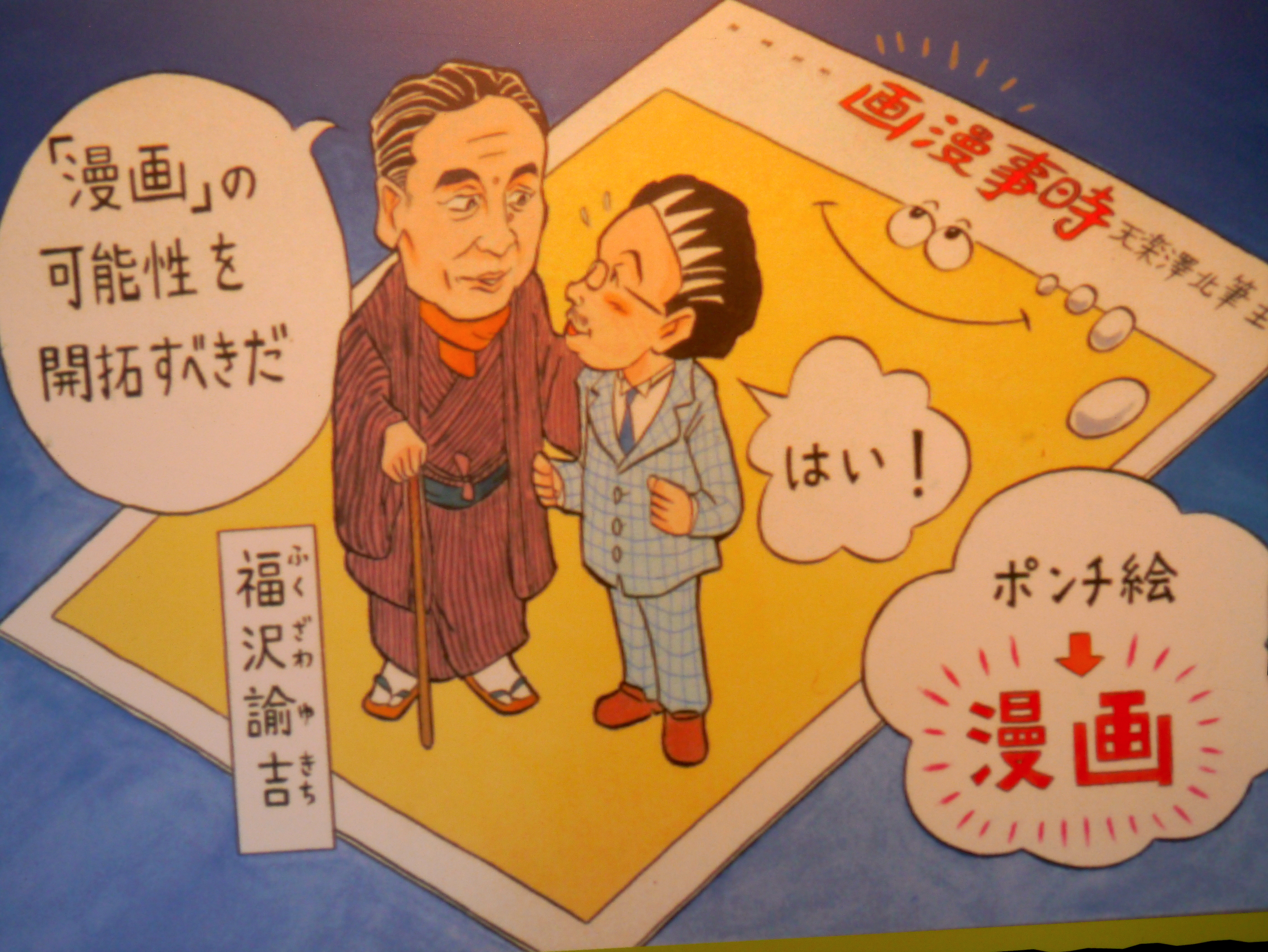 北澤樂天漫畫之路的第一段機緣就是與福澤諭吉的相遇。福澤諭吉,日本歷史上最重要的啟蒙者與思想家,最大面額紙鈔一萬圓上的肖像人物便是福澤諭吉,足見他的重要性。他的名言是「一身兩世」,也就是日本從封建時代到明治維新,一個人歷經兩種時代,思維必須緊隨時代與時俱進。福澤諭吉本身就是一身兩世的典範,他從傳統的漢學到蘭學,再從蘭學到英語,可以說緊緊追隨文明的潮流。