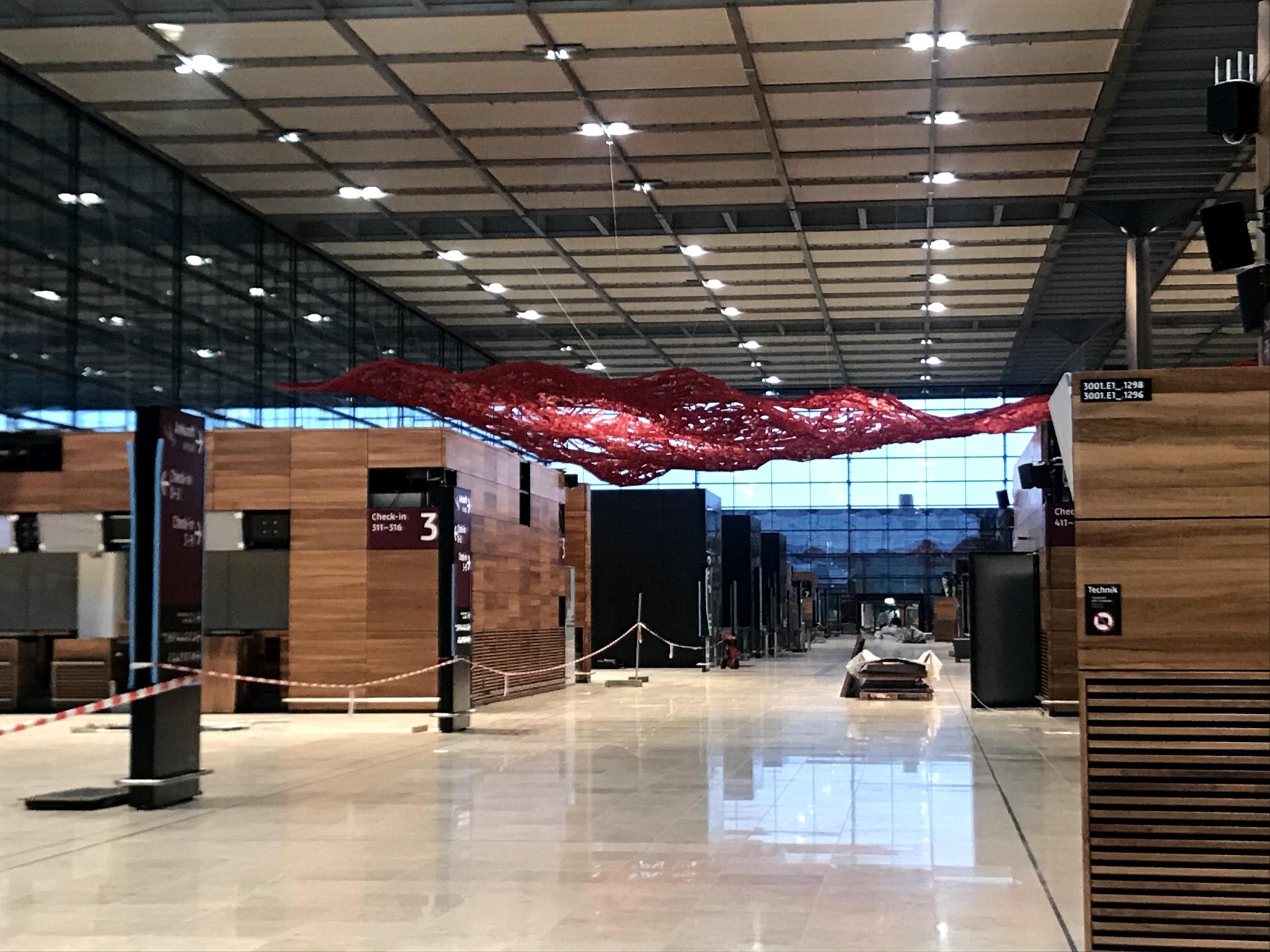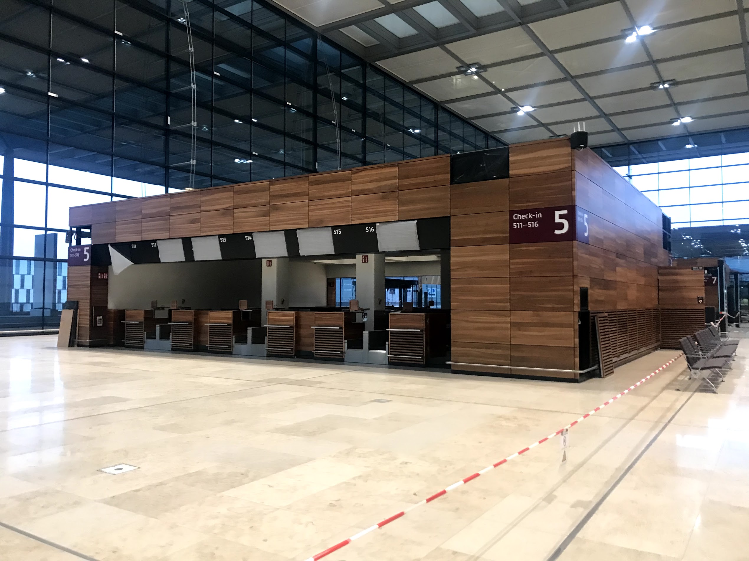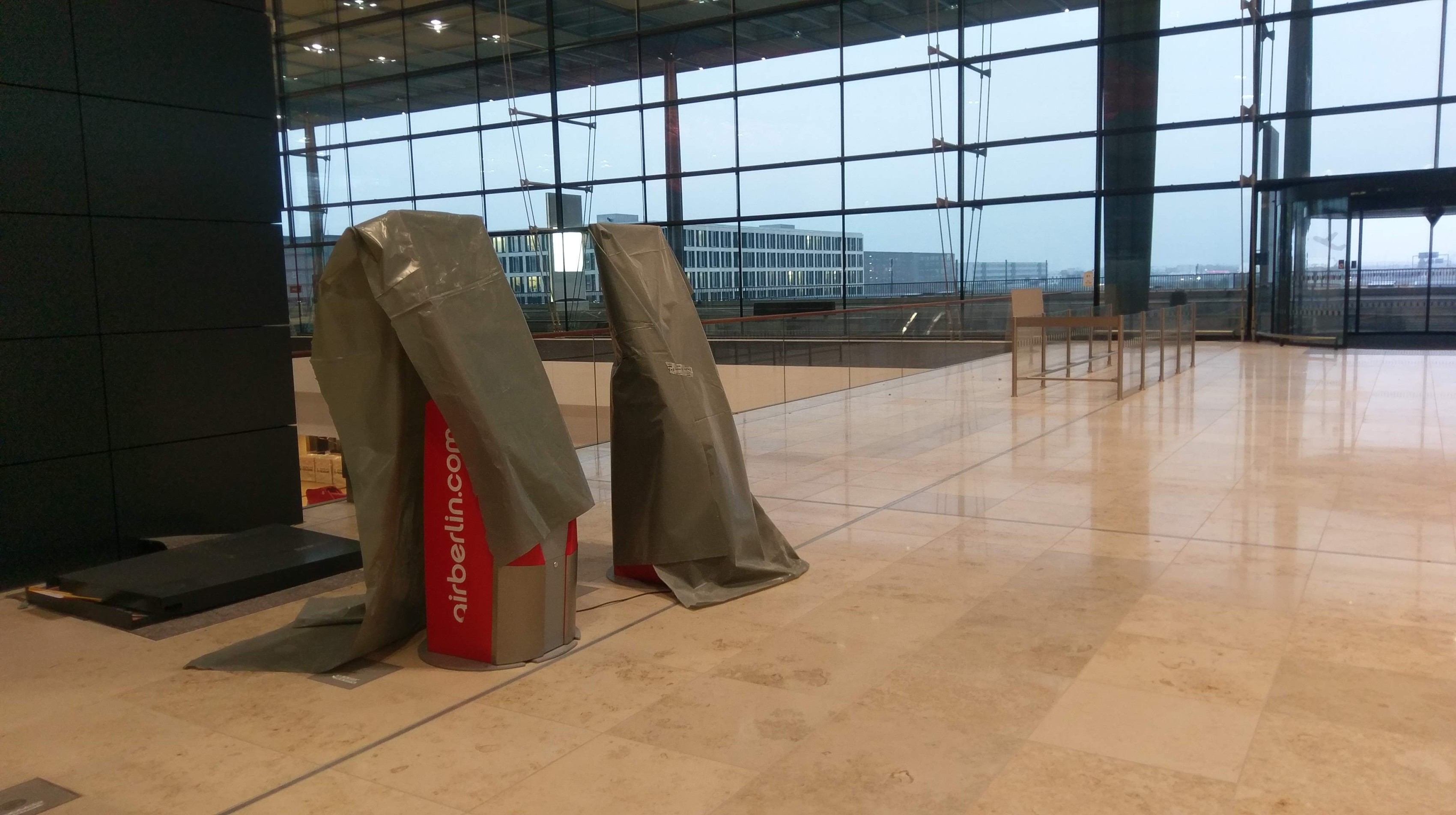 走進仍未正式完工的機場,建築主體基本完成,但仍在做最後衝刺與調整:高低施工鷹架、用塑膠模包裹著的電子螢幕(前陣子才因爲「使用多年已經故障」,花了50萬歐元更換750面螢幕);部分天花板被掀開,上方的管線一覽無遺;原本已設置好的椅子被推到一側,蓋上了塑膠布;登機櫃台外拉上了禁止進入的警示帶;走廊上麥當勞餐廳的招牌,被鋁箔墊包了起來。