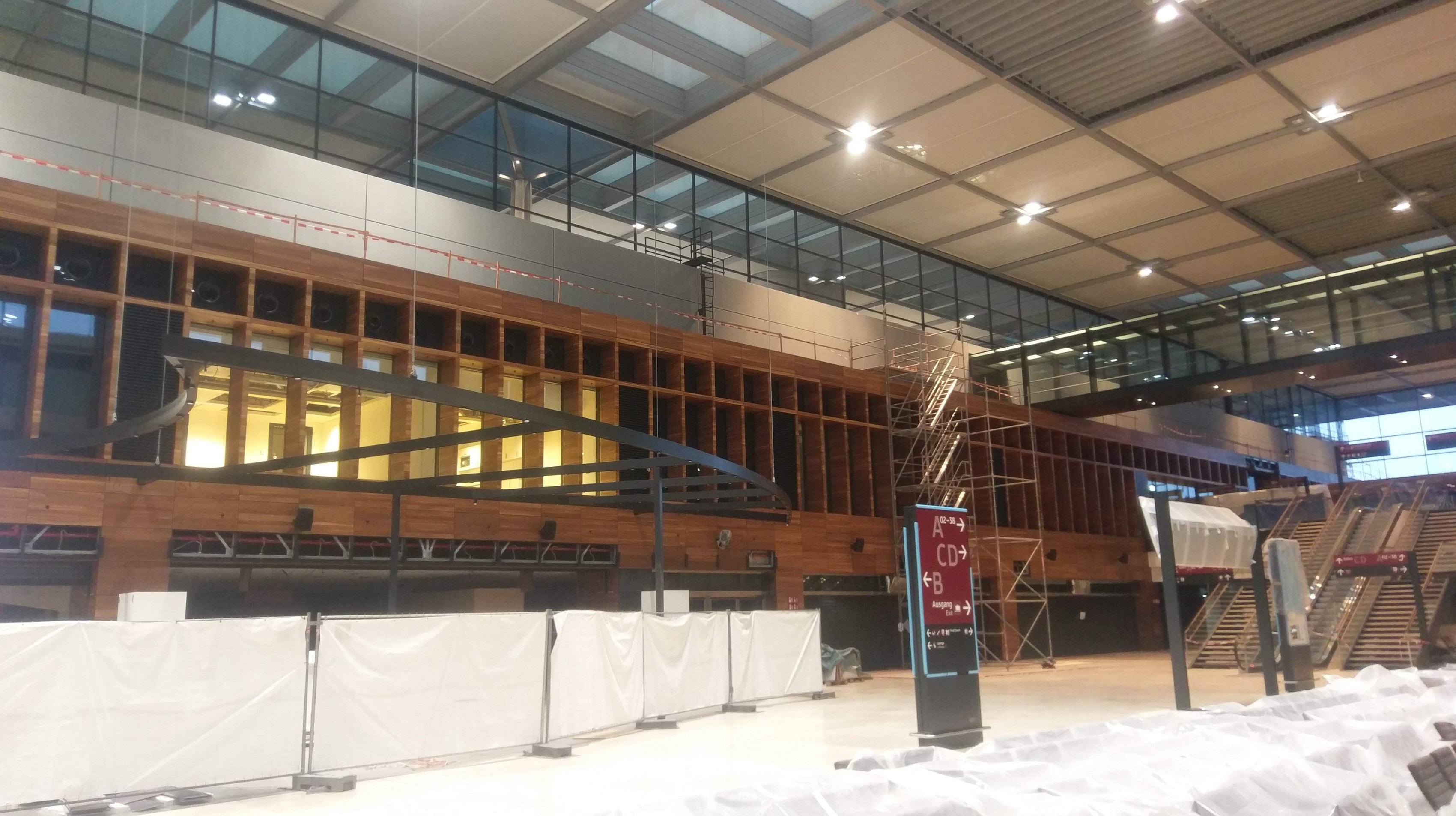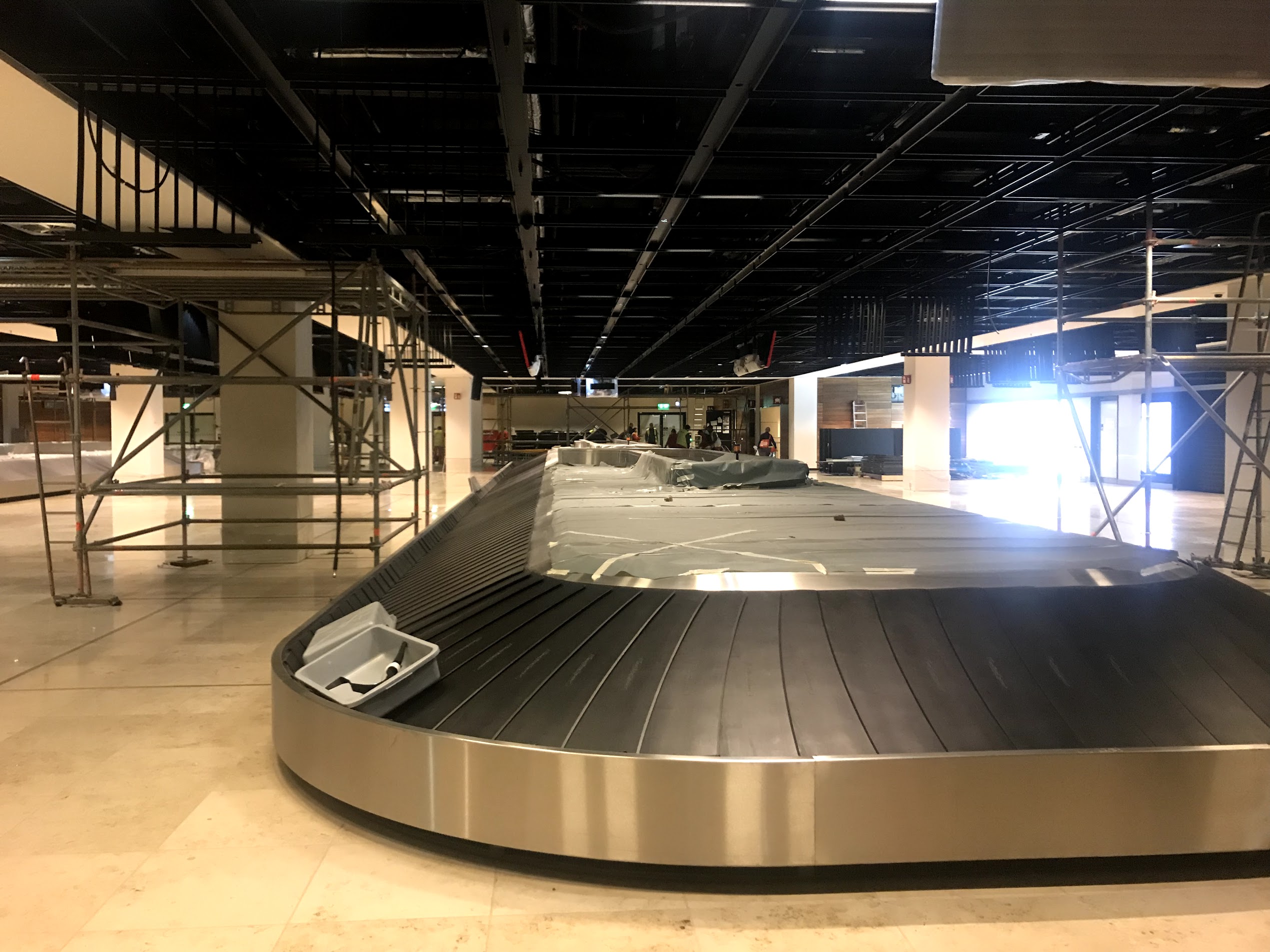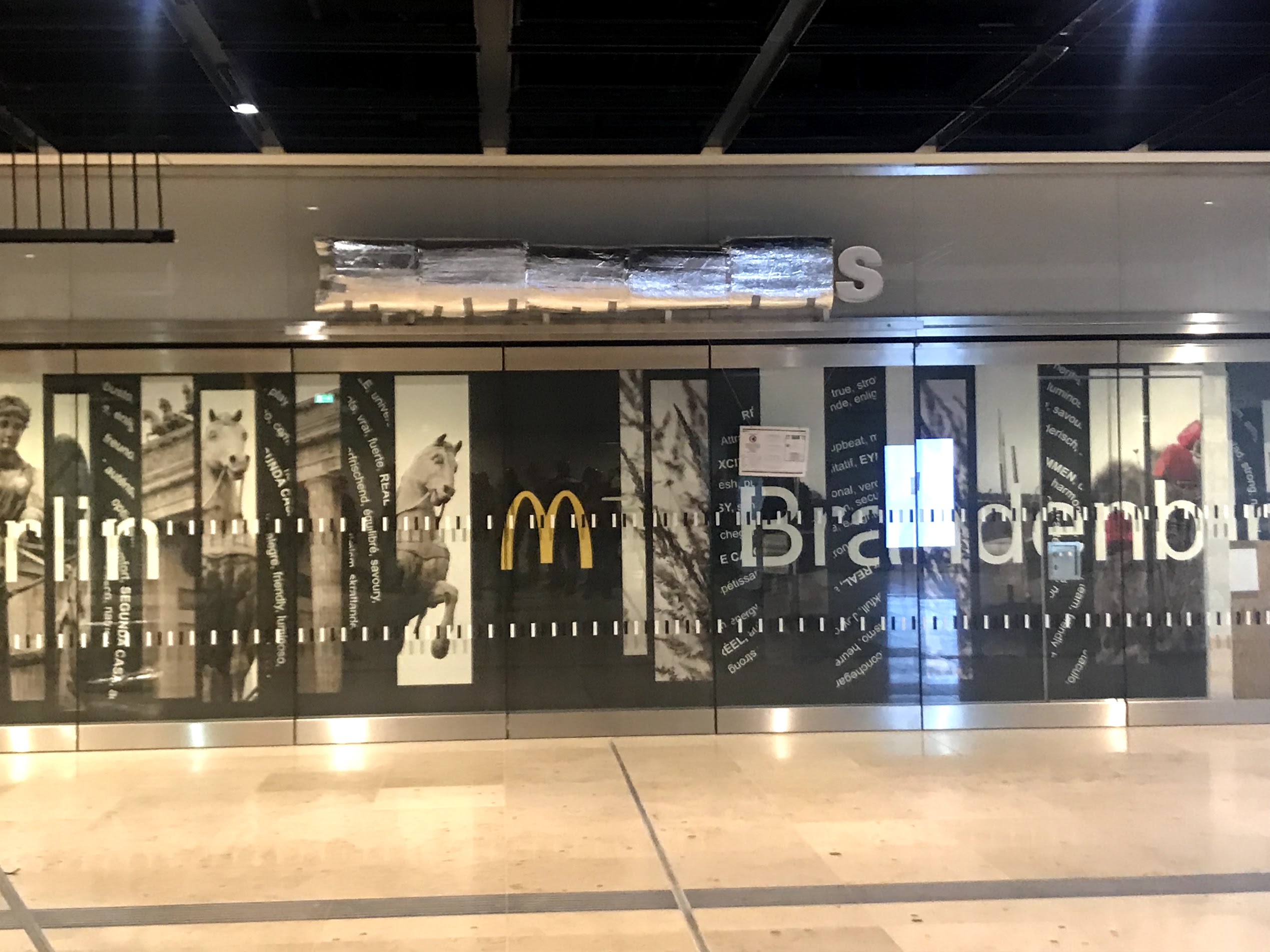走進仍未正式完工的機場,建築主體基本完成,但仍在做最後衝刺與調整:高低施工鷹架、用塑膠模包裹著的電子螢幕(前陣子才因爲「使用多年已經故障」,花了50萬歐元更換750面螢幕);部分天花板被掀開,上方的管線一覽無遺;原本已設置好的椅子被推到一側,蓋上了塑膠布;登機櫃台外拉上了禁止進入的警示帶;走廊上麥當勞餐廳的招牌,被鋁箔墊包了起來。