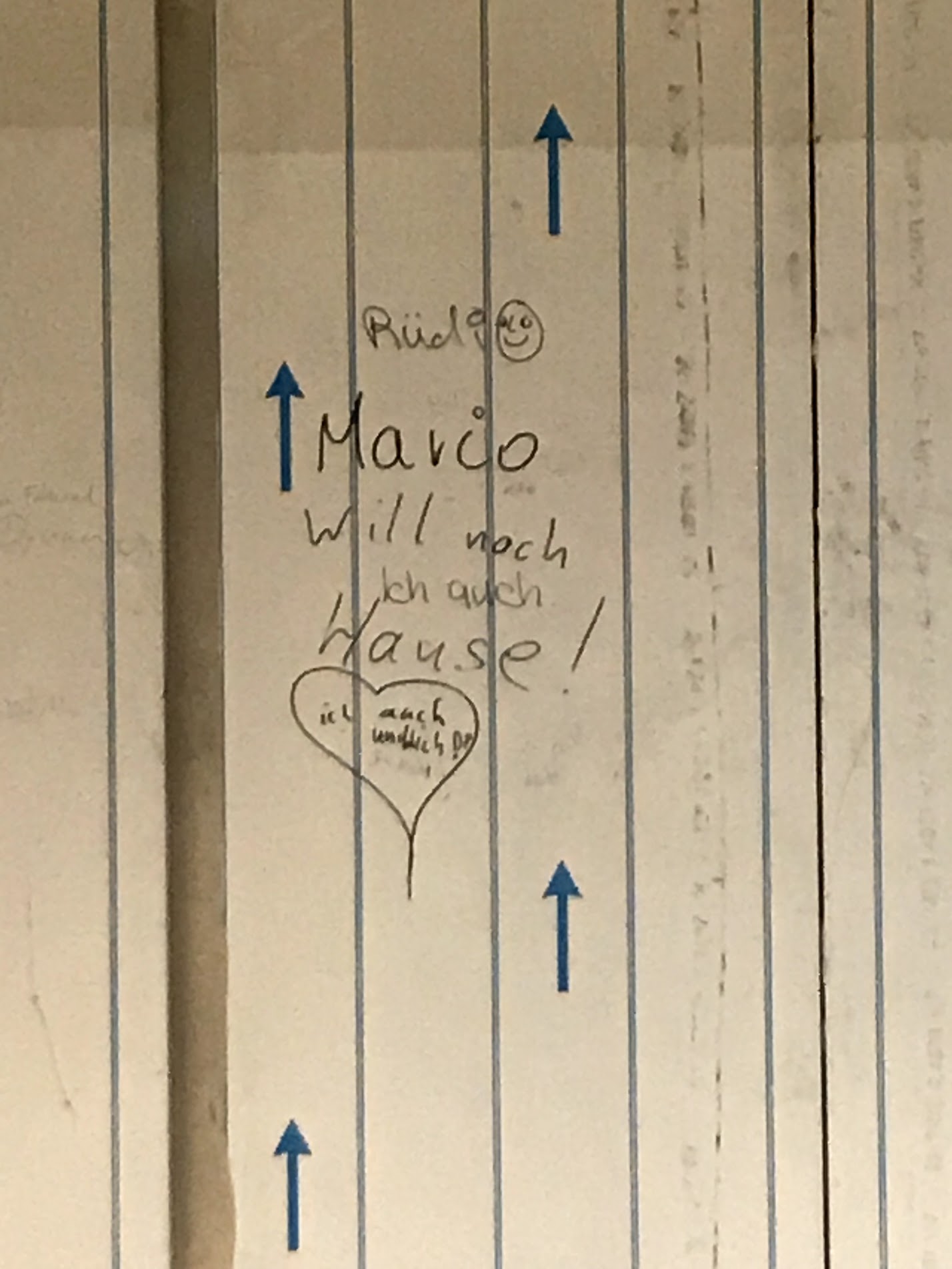一個電梯門上,離家打拼的工人們留下凌亂的字跡:「馬力歐想要回家(Mario will nach Hause)。」在那個想家的留言旁,另外一個人寫下:「我也是(Ich auch)。」