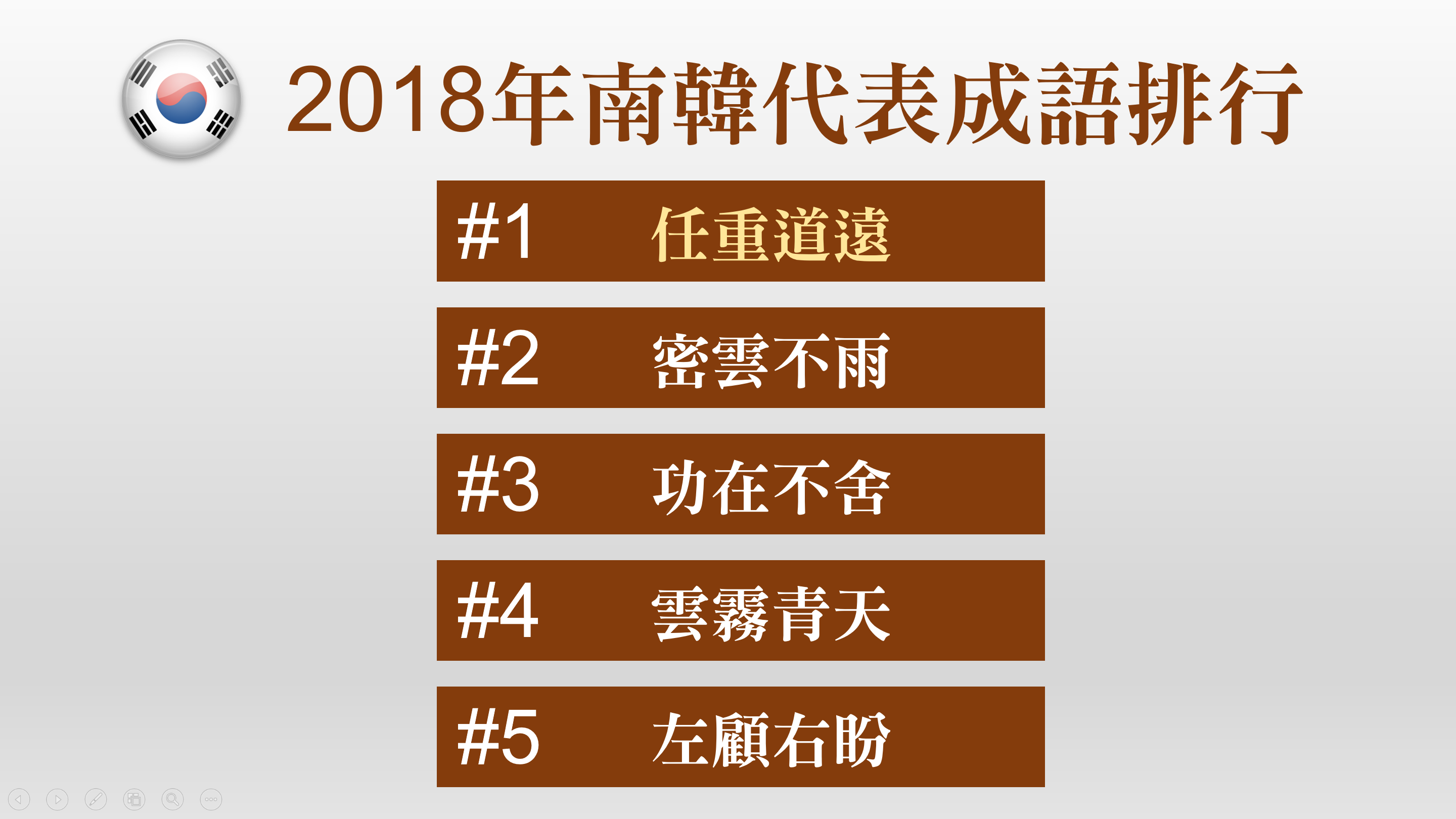 歷經保守派的李明博與朴槿惠兩任總統,從2008到2017年執政的9年間,南韓年度成語都頗為尖銳,諸如「掩耳盜鐘」、「倒行逆施」、「昏庸無道」都接連出現,但自文在寅總統上任後,這兩年的代表成語「破邪顯正」和「任重道遠」,批判色彩就柔和許多。