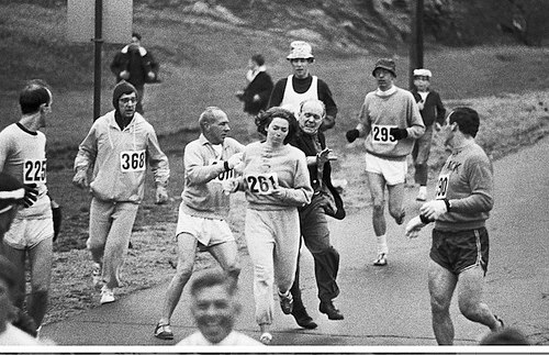 直至 1967 年,當時 19 歲的女生 Kathrine Switzer 偷偷參與賽事。那天,Kathrine 開跑才 6 公里,便被巡航巴士上的職員發現。總監看見她後勃然大怒,更立即跳下巴士,衝上前去拉扯 Kathrine,要趕她離開比賽場地。這時 Kathrine 身旁的男友人挺身而出,撞開那個總監,使 Kathrine 成功避過阻攔,順利跑完42K抵達終點。