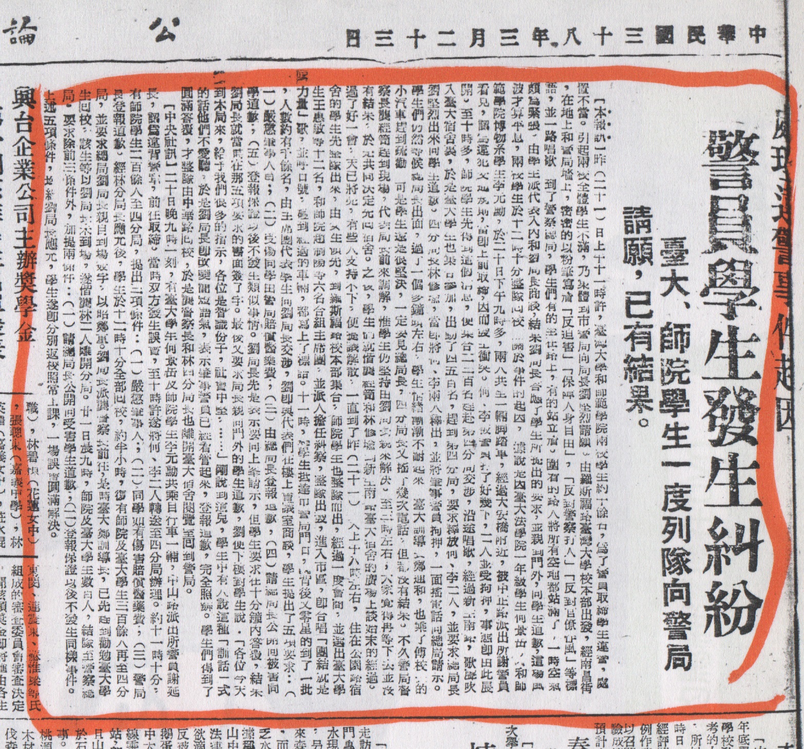 三月十九日晚上,台大和師院兩名學生,共乘一輛腳踏車從士林回學校宿舍時,被第四分局(現在的大安分局)的警員看見,上前取締時,警察動手毆打學生。於是,學生的怒火被點燃了。