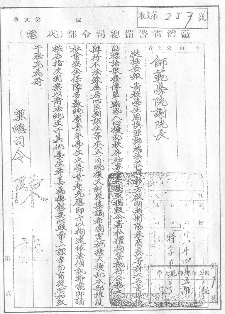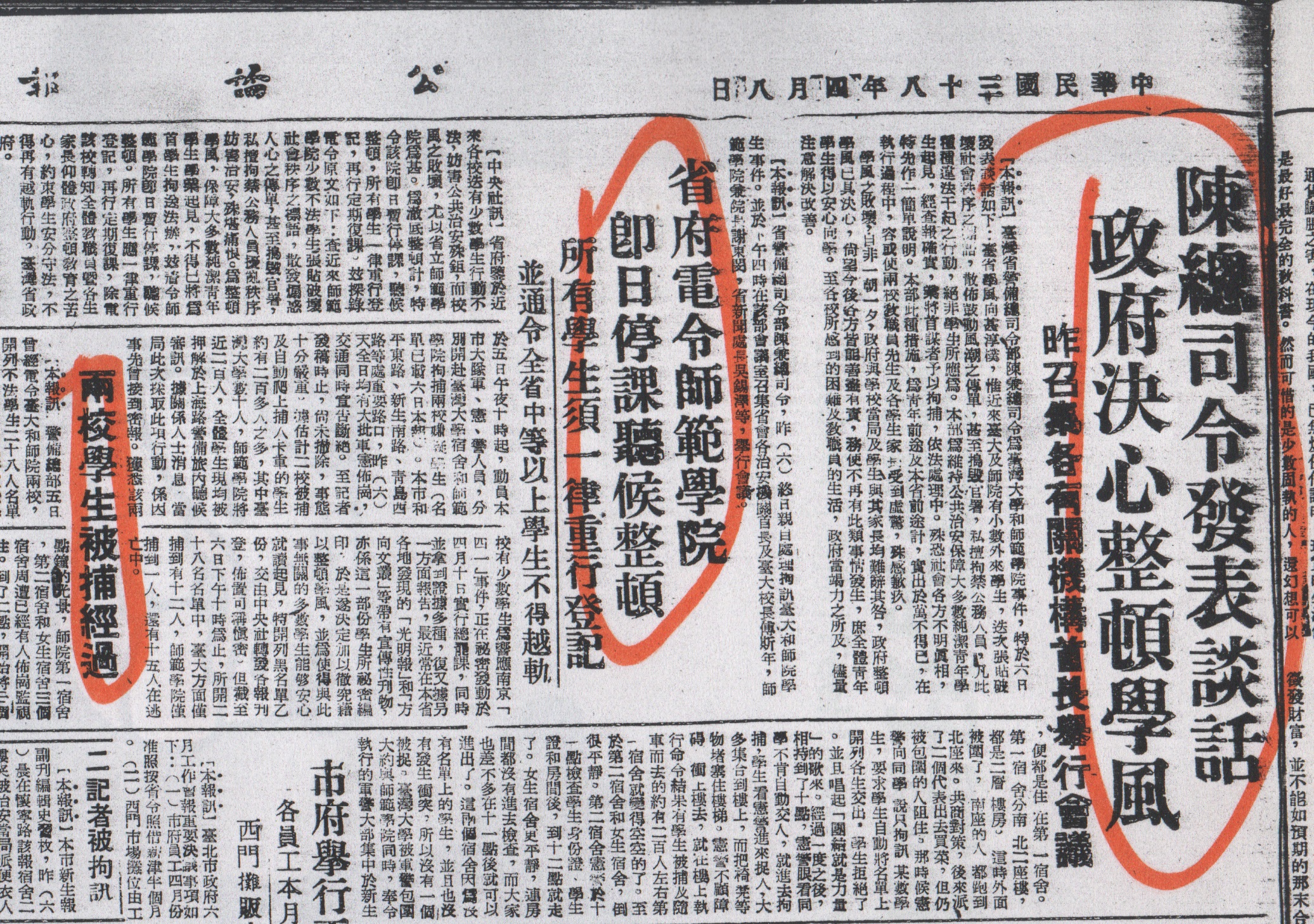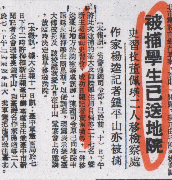 當時,同一時間還有非學生被逮捕:新生報編輯史習枚、成功日報記者董佩璜、台中市新聞記者公會理事長鍾平山、名作家楊逵。這種藉機逮捕後,再另案處理的案件,在蔣介石極權統治時期不勝枚舉。