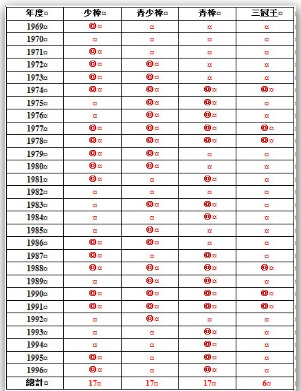 台灣的三級棒球從1974年首次取得「三冠王」後,幾乎長期壟斷世界少棒聯盟的世界大賽(World Series)冠軍賽事。三級棒球分別都拿下了17次冠軍,同時取得6次三冠王,這些記錄當然是世界之冠。1997年因為組隊方式等資格問題,台灣退出世界少棒聯盟的三級棒球。2003年台灣再度重返世界少棒聯盟的少棒賽,2004年來自高雄的壽天國小成功取得遠東代表權再度進軍美國威廉波特。2010年,高雄重慶少棒隊首次為台灣進軍少棒聯盟的「次青少棒」(Junior League,13-14歲級)大賽,並取得冠軍。
