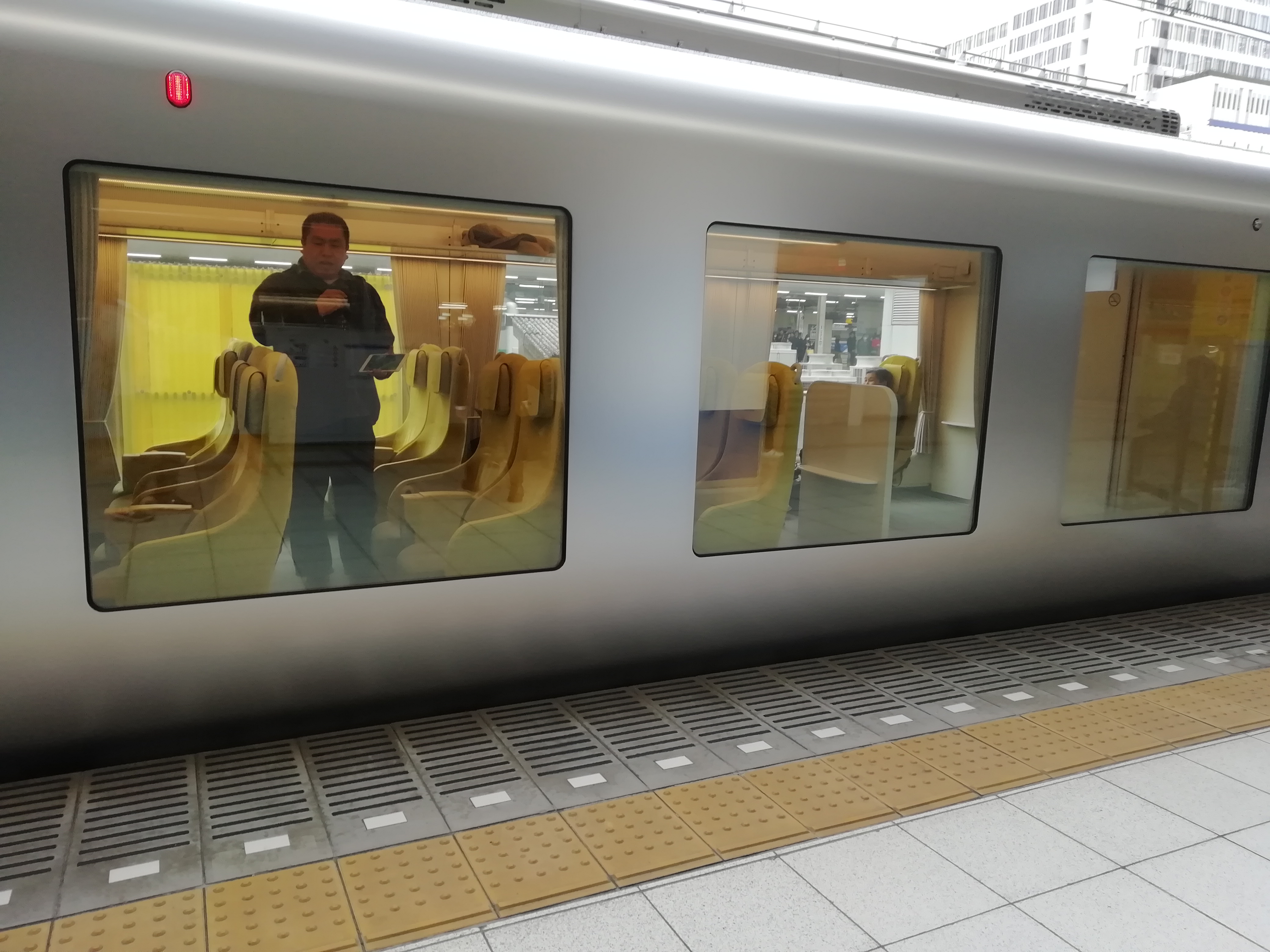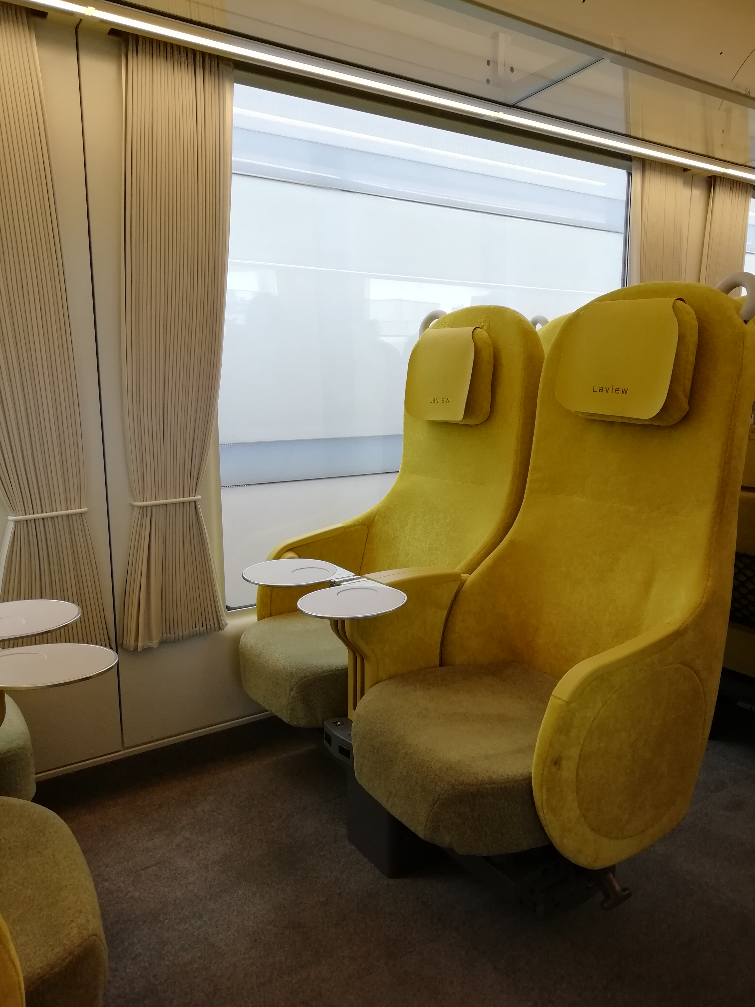 卡通講半天那電車怎麼樣呢?說真的,那天快搭完全程我都找不到怎麼形容,因為沒看過這樣的車。車頭是圓的像外星生物又像蝌蚪,車身玻璃又大又方,進到車廂以後通道地面被畫得一塊一塊像地磚,乘客席腳下踩的是毛絨絨地毯。當然很漂亮高級,日本多得是漂亮電車,不過Laview真的哪裡不太一樣。