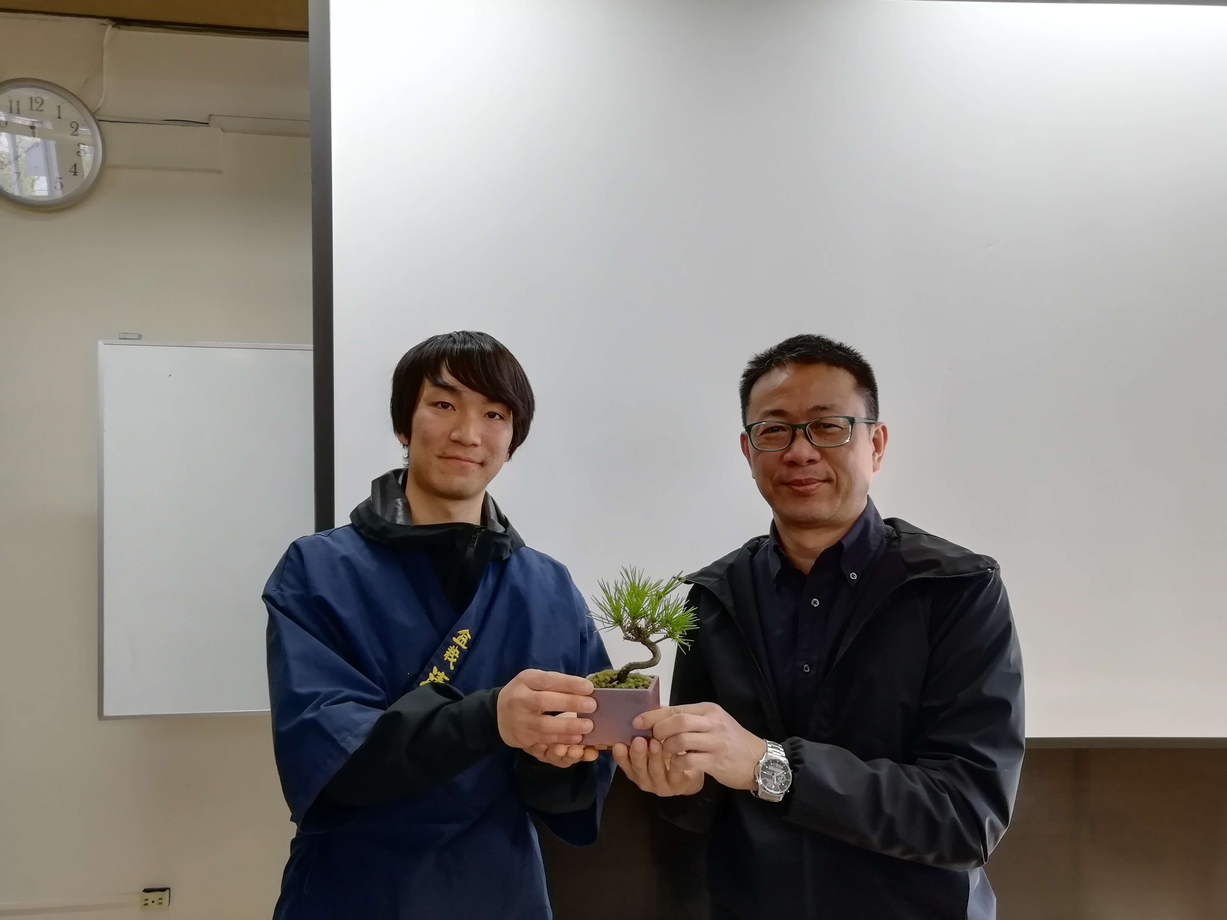 課程最後義大利外交官的寶貝兒子,捧著親手種的盆栽跟師傅合照,感覺像千辛萬苦領到獎狀一樣,大家群起仿效。我把迷你盆栽放在縮小版的金色屏風前拍照,經過手機鏡頭虛張聲勢,乍看已有幾分「百萬」氣勢。