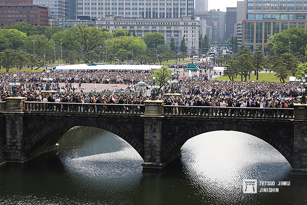 5月4日的即位一般參賀,是新天皇德仁登基之後,第一次率領皇室成員與民眾面對面,不但吸引日本國內外各大媒體前往採訪,日本民眾也相當期待,凌晨開始就有不少民眾,陸續來到皇居二重橋前,到了上午八點時,現場已經有超過五萬民眾,人龍綿延數公里。
