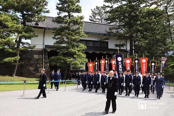 每次一般參賀的開門,都會有團體手持錦旗,徹夜等待,搶先在入場隊伍的最前面,相當有毅力。所以一開門就會看到錦旗隊伍,跟隨在宮內廳與皇宮警察的後方入內,非常醒目。