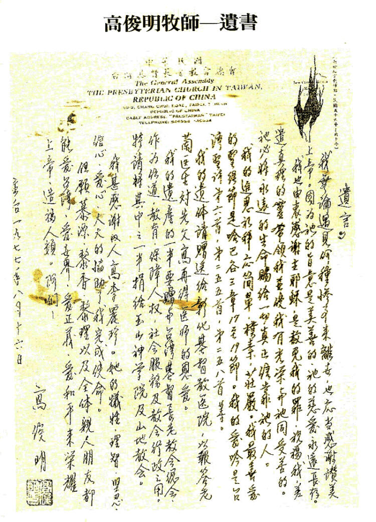 這幾次尖銳的對立與衝突,使得中國國民黨政權更加積極要整肅長老教會,在解嚴之前,還長期組成專案進行監控與滲透,最後,終於中國國民黨政權在美麗島事件中逮到機會,包括高俊明在內的多名教會人士,基於教義與人權保護美麗島事件人士,而相繼被判刑繫獄。