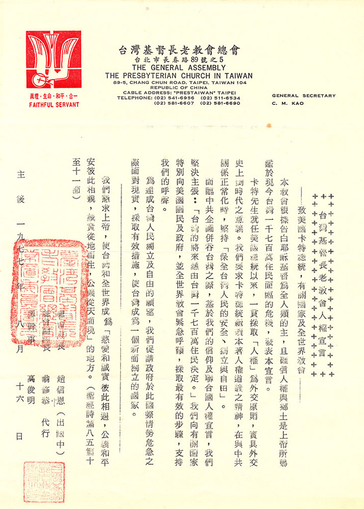 長老教會並不畏懼蔣政權的壓力,同年(1975年)年底,美國總統福特訪問中國之前,長老教會再度發表《我們的呼籲》,除了呼籲教會『以愛心說誠實話,積極關心我國政治前途』之外,仍特別強調『有權使用自己的語言崇拜上帝』,要求國民黨政府『維護憲法所賦予人民信仰宗教之自由』。